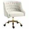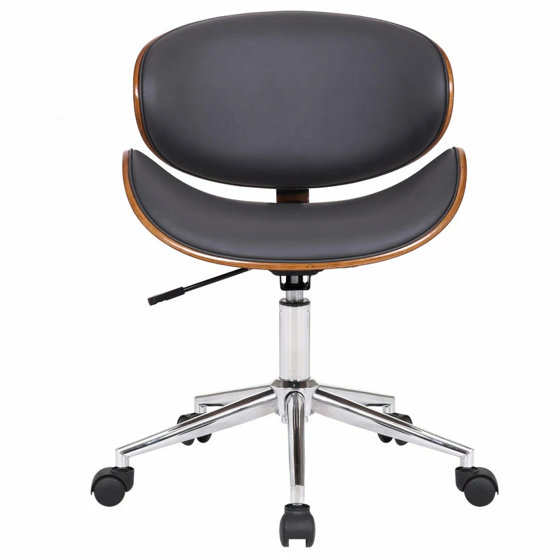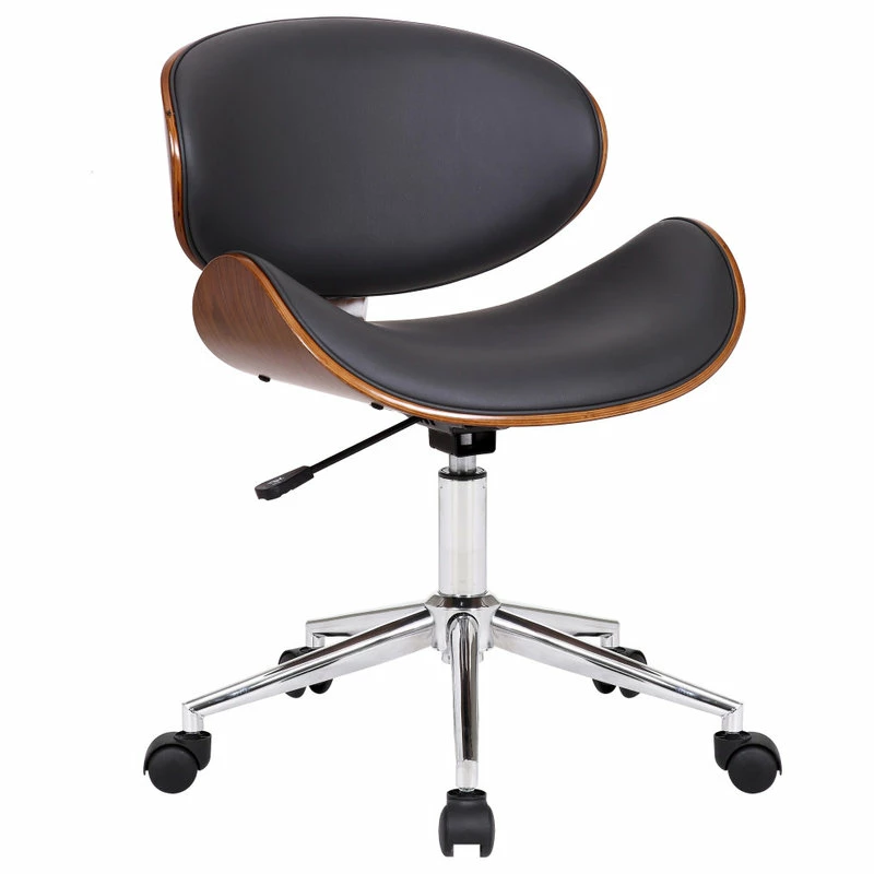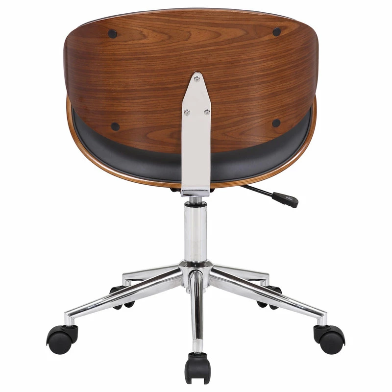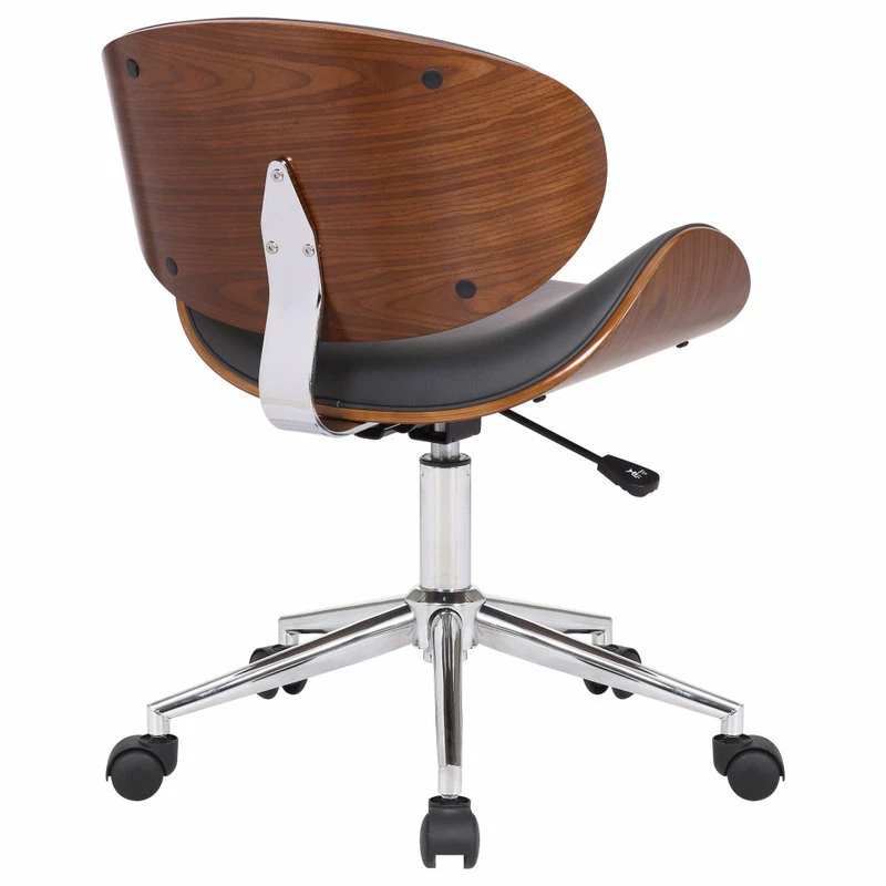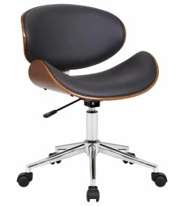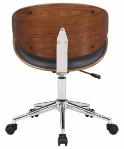 Our Daphne Office Chair features a walnut veneer finish seat and grey Leatherette. The cushioning provides both stability and comfort, and the 360 degree swivel makes maneuvering the chair easy around the office. Black plastic caster wheels are affixed to the bottom of a chrome-plated steel base and adjustable height gas piston. This mid-century and modern design mix adds a unique style to your office and breaks the rules of typical office seating.