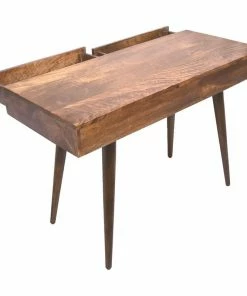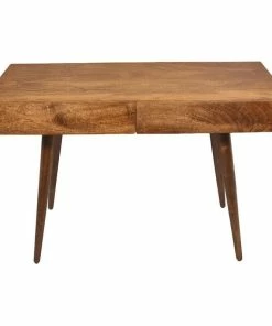 Introduce a touch of mid century style to your ensemble with this writing desk in brown finish. It is constructed from mango wood and features two equally sized drawers, supported by diagonally tapered legs. Minimal in design, it comes with aesthetically visible wood grain details that accentuates its overall look. This writing desk provides a perfect placement in your home office and study room while the smooth rectangular is spacious enough to offer a proper arrangement of your laptop, stationaries and decorative items.