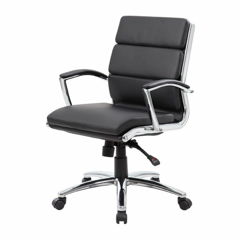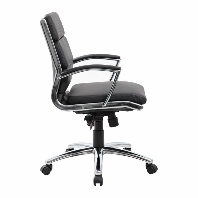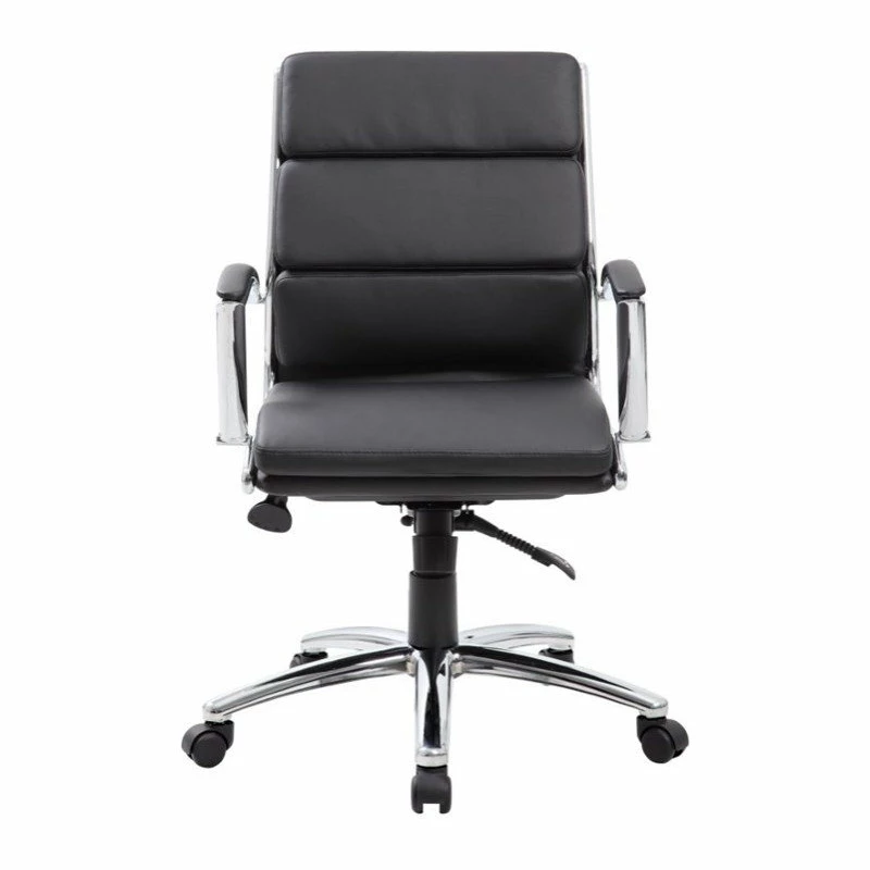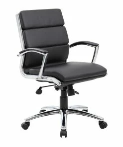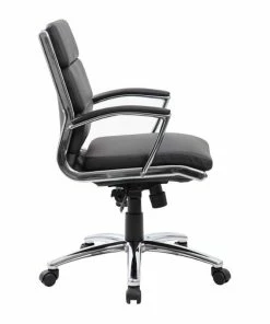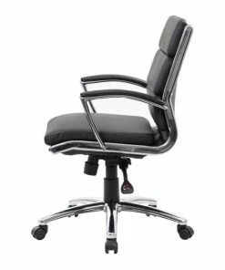 Upholstered with ultra-soft, durable and breathable Black CaressoftPlusβ’ upholstery. Mid-Back. Metal chrome plated arms topped with soft arm pads. Heavy duty 2 paddle spring tilt mechanism with infinite lock. Upright locking position. Pneumatic gas lift seat height adjustment. Adjustable tilt tension control. Large 27″ chrome base for greater stability. Hooded double wheel casters.
