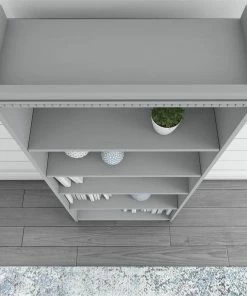Bring a slice of modern farmhouse styling into any home office or living space with the Bush Furniture Fairview 5 Shelf Bookcase. Three adjustable shelves move up and down to accommodate books and decorations of various sizes while two fixed shelves provide extra stability. Each shelf supports up to 50 pounds, so organizing a collection of paperback and hardcover books is no problem. Measuring 30W x 12D x 69H, this tall bookshelf offers plenty of vertical storage to keep your personal library in order without taking up too much floor space. Use a single Bookcase on its own or place a set of two or more side by side for even more storage and display capacity. This farmhouse bookcase is tested to meet ANSI/SOHO quality standards for safety and performance and is backed by a 6 Year Warranty. See the full collection for coordinating items to complete your space with relaxed cottage styling. Materials: Engineered Wood and Laminates