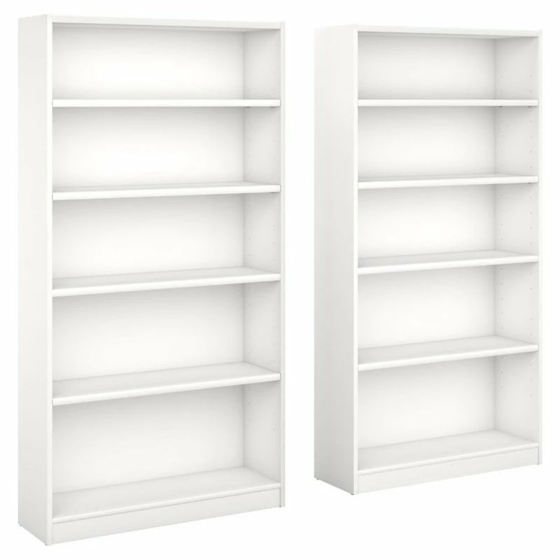 The Bush Furniture Universal Tall 5 Shelf Bookcase – Set of 2 provides a versatile organization solution that allows you to show off your personal library or brighten up the room with pictures and decorations. Each Bookcase has three adjustable shelves that move up and down to accommodate larger items like binders and photo albums while two fixed shelves offer added stability. The sturdy one-inch thick shelves prevent sagging and have a weight capacity of 50 pounds each, so storing magazines, hardcover books, or vinyl records is never a problem. Tip Guard(TM) safety features include a stable design and wall attachment hardware for family-friendly safety in any space. The bookcases have been tested with a 50 pound hanging weight to create a safe environment in any space. This tall bookshelf set meets ANSI/BIFMA standards for safety and performance and is backed by a 1 Year Warranty.