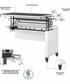 Upgrade your personal workspace with the ergonomic Bush Furniture Somerset 72W 3 Position Sit to Stand L Shaped Desk. As a quality alternative to desktop risers, the innovative 42W x 24D Sit to Stand Return offers all the health benefits of a standing desk with the versatility of more expensive electric height adjustable options. The built-in mechanical Lift-n-Lock system allows the desktop to lock into place at standing heights of 35, 38, and 41 inches and easily returns to a seated position. The 72W x 24D Office Desk includes a file drawer that opens on full-extension ball bearing slides for easy access to legal and letter size documents in addition to a box drawer for supplies and utensils. Fixed surfaces are tested to meet ANSI/SOHO standards for safety and performance while the mechanical lift is rigorously tested to Bush Furniture quality standards. Backed by a 6 Year Warranty.