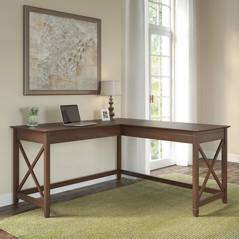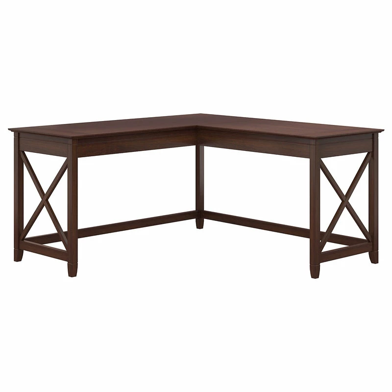 With its practical design and easy going style, the Bush Furniture Key West 60W L Shaped Desk offers an ideal workspace solution for home offices. Save floor space in compact areas by placing the Desk in a corner or make use of the fully finished back to take a prominent position in the middle of the room. At 60W x 60D, the durable work surface is spacious enough to spread out with a computer, paperwork and more when taking on your task of the day or just browsing the web. A sturdy post leg design with unique X pattern accents on the side panels creates a relaxed, open appearance while thoughtful construction and quality materials allow the corner desk to support up to 200 pounds. Available in your choice of attractive Bing Cherry, Washed Gray and Pure White Oak finishes, this office desk is a perfect choice for homes that embrace coastal and farmhouse decor. Complete your workspace with a wide range of coordinating Key West products including Desktop Organizers, File Cabinets and a 5 Shelf Bookcase (all sold separately). The L shaped computer desk is tested to meet ANSI/SOHO quality standards for safety and performance and is backed by the Bush Furniture 1 Year Manufacturer’s Warranty.