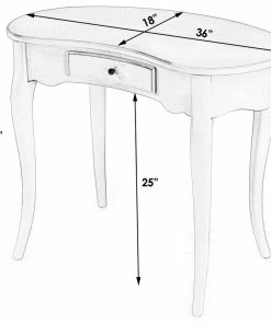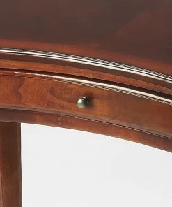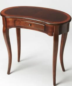 The elegant Edgewater Desk features a crescent-shaped tabletop supported by four stylized, tapered cabriole legs and a drawer with antique brass finished hardware. It is crafted from solid poplar and cherry veneer in a cherry finish.