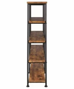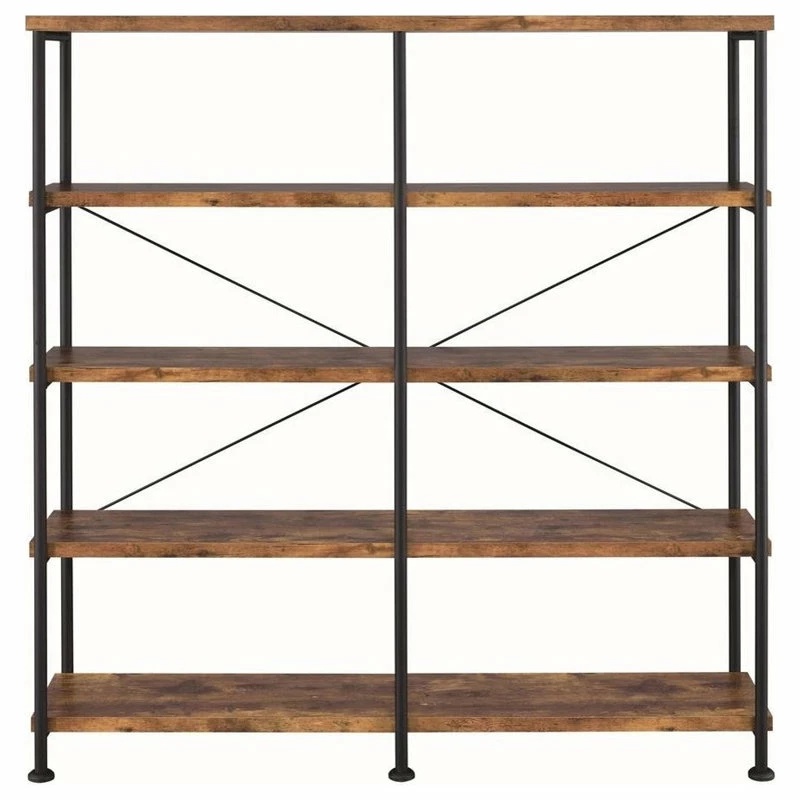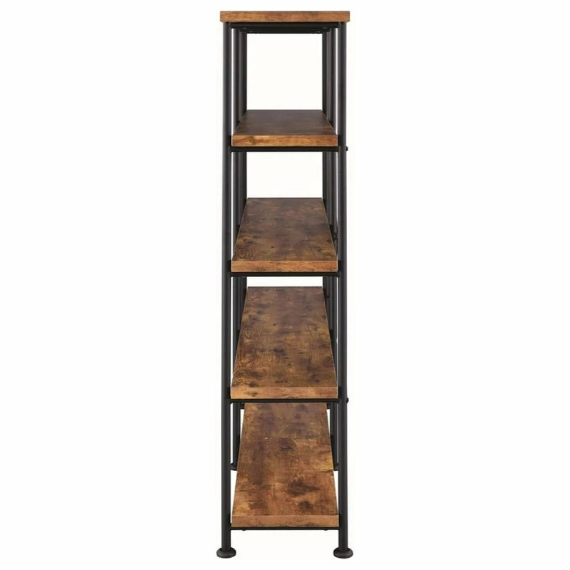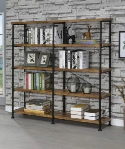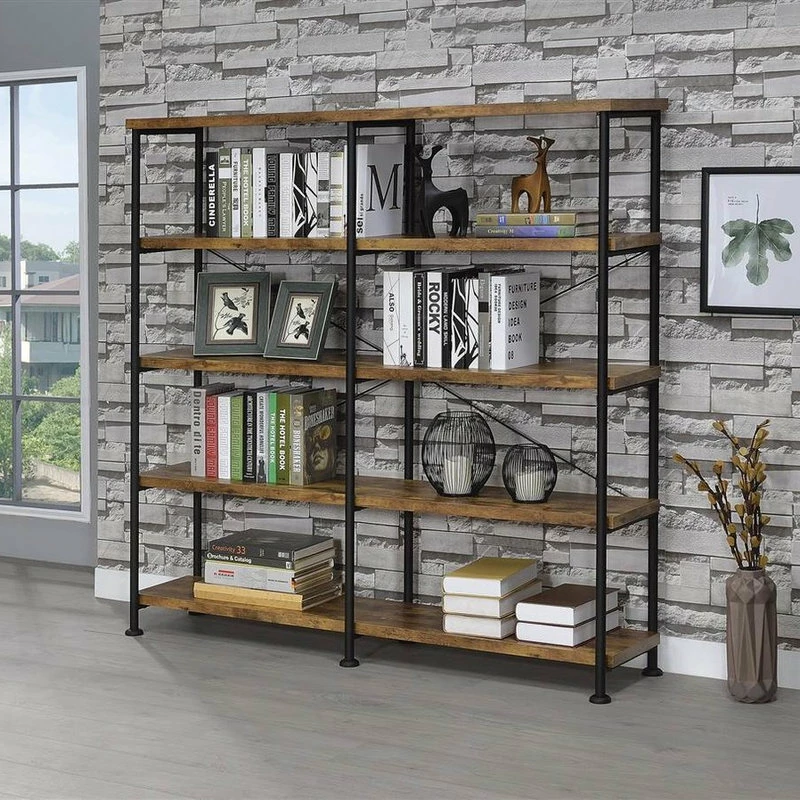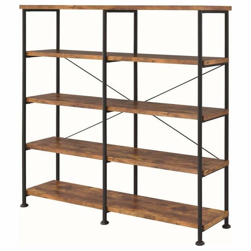 Delight in this industrial-style, four-tiered double-wide bookcase finished in antique nutmeg, with metal frame finished in black. With its double-wide design, this bookcase offers great storage capabilities without being overbearing in stature. The metal pipe framing and contrasting wood shelving are compelling complements to each other and bring the bookcase’s industrial aesthetic to life.