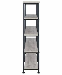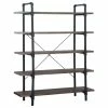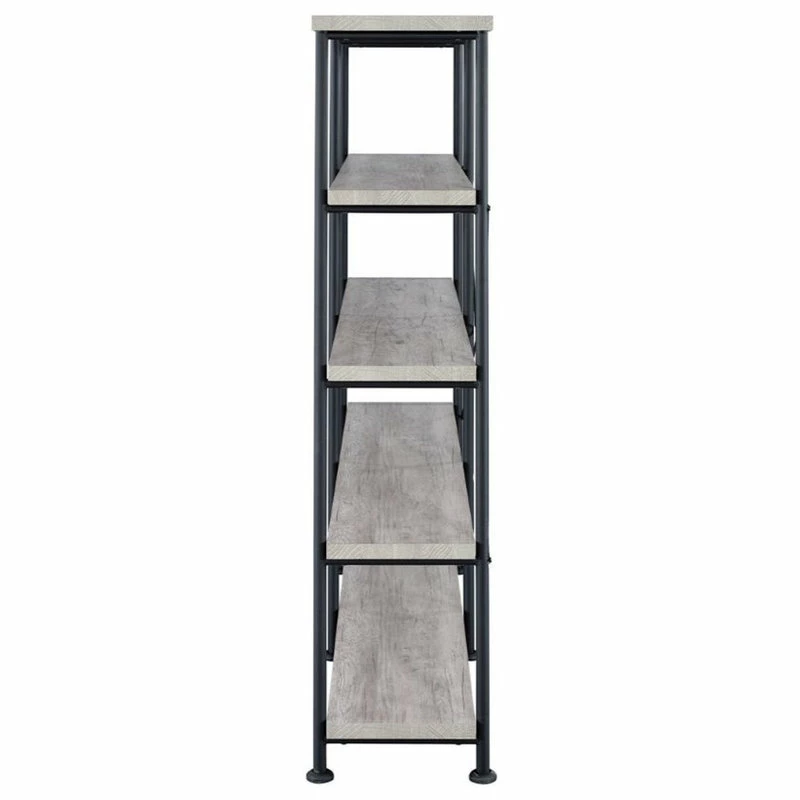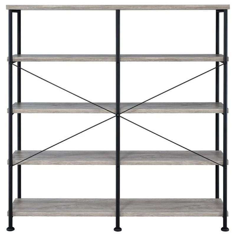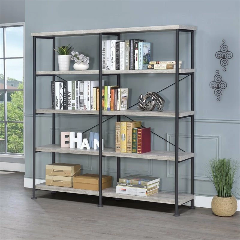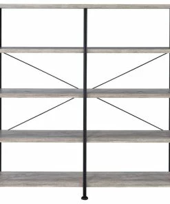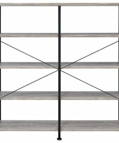 - Rustic industrial bookcase in gray driftwood with black metal frame boasts clean lines for your modern decor