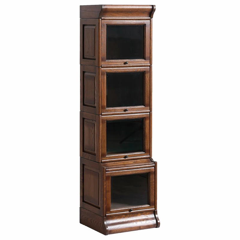 This is an Arts & Crafts Mission Oak Narrow Barrister bookcase 4 stack high made with solid white Oak. This is a quality reproduction of the 100 year old Stickley piece, which are very rare and when found are usually not in good condition. is very sturdy, solid and very well made with alot of attention to details. The stain is medium to dark with hand rubbed lacquer finish just like the orignal old stickley pieces were made. Measures 67.5 inches high, 18 nches wide and 17 inches deep.