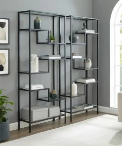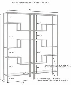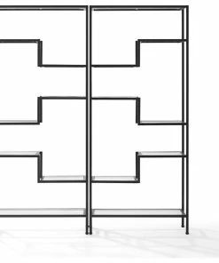 Modern beauty and functional simplicity are the hallmarks of the Sloane 2pc Etagere Set. Ready to display precious keepsakes or your favorite books, this etagere set’s sculptural steel frame features sturdy tempered glass shelves. Paired together the etageres will be the focal point of your living room or home office, with the variable shelf heights and geometric design creating a unique storage space with Art Deco flair.