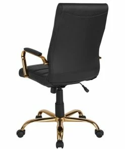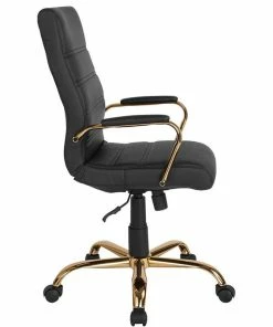 An elegant blend of comfort and style, this high-back LeatherSoft office chair is the perfect seating solution for your workspace. Crafted from black LeatherSoft material with gold arms and base, the ergonomic design brings a sleek look with ample durability and support for long-term use. Designed for exceptional comfort, this LeatherSoft office chair features a cushioned seat and back upholstered in white LeatherSoft for softness and durability. Padding on the arms lends additional comfort, while horizontal stitching along the seat and back adds a touch of refinement. The high-back office chair features extended height to support your upper back and help relieve back tension. A waterfall front seat edge removes pressure on your lower legs, to help improve circulation during long hours at your desk. Complete your custom fit with the pneumatic seat height adjustment lever and a tilt-lock mechanism for a rocking and reclining motion. Easily maneuver through a variety of tasks with the full 360-degree swivel chair motion that is ideal for shifting between your computer, phone, and more. When you need to reach things a little further away, simply roll your chair with the smooth movement of the wheeled base. A bright gold finish adorns the frame and arms of this office desk chair, creating a sleek and timeless look. The classic black LeatherSoft pairs effortlessly with any office decor style, creating a comfortable and elegant impression that’s perfect for residential or corporate workspaces.