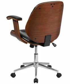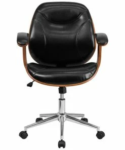 This office chair features a beautiful walnut bentwood frame with glossy black LeatherSoft upholstery and padded arms. LeatherSoft is leather and polyurethane for added softness and durability. The mid-back design is a practical choice in a multitude of settings. A mid-back office chair offers support to the mid-to-upper back region. This chair, with built in lumbar support and contoured back and seat, is ideal for anyone who does a great deal of typing. The tilt lock mechanism rocks/tilts the chair and locks in an upright position while the tilt tension adjustment knob adjusts the chair’s backward tilt resistance. The waterfall front seat edge removes pressure from the lower legs and improves circulation. Chair easily swivels 360 degrees to get the maximum use of your workspace without strain. The pneumatic adjustment lever will allow you to easily adjust the seat to your desired height. This chair is sure to make an impression and become the focal point in your office or home office.