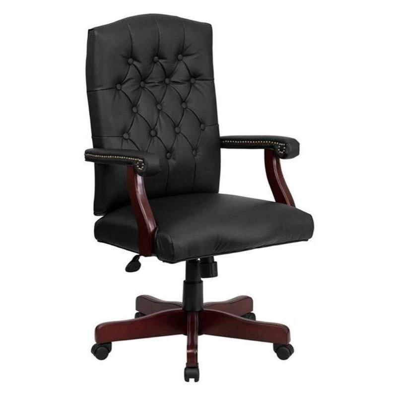 Give your office a refined look with a traditional tufted office chair that never goes out of style. This classic executive office chair makes a statement all on its own to let clients know that you are about your business when they enter your office. This luxurious traditional desk chair is upholstered in sumptuous LeatherSoft material that blends leather and polyurethane for added softness and durability. Handsomely styled, this swivel office chair with all its buttoned glory has an arched top and a 5.5” thick cushioned seat for comfort. The scroll arms with brass nail accents offer a stylish place to rest your arms. Functions include a tilt lock mechanism, a knob underneath the seat to control the tilt function, and an adjustable swivel seat height with pneumatic lever. Although classically styled, this button tufted swivel chair updates your office to give you a complete look that you’ll love. Round out your home office space or business office with our mahogany computer desk for a rich arrangement.