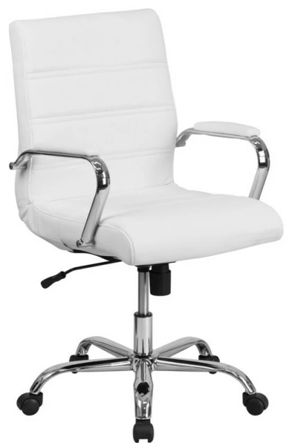 Toss out that old and boring office chair that you’ve had for years, because it’s time for an upgrade with this sleek mid-back LeatherSoft office chair. No longer used in just offices, you are seeing office chairs used in nail salons, car shops, and stores to help busy workers achieve maximum comfort while performing their work duties. Upholstered in soft and durable LeatherSoft upholstery and paired with chrome finishing help construct this modern office chair. Designed with your comfort in mind, this ergonomic desk chair features ample padding to get you through an 8-hour workday or be your seating of choice to furnish your conference room. With its adjustable features you can lean back while you take a quick phone call or lock in an upright position when it’s time to focus. The knob located underneath the seat adjusts the force needed to recline. Improve the look at your desk or work area with this stylish Mid-Back White LeatherSoft Office Chair with Chrome Base that is highlighted by attractive horizontal line stitching. A waterfall front edge seat reduces pressure off your legs while the armrest pads relieve the pressure off your necks and help round out the look and comfort of this chair.