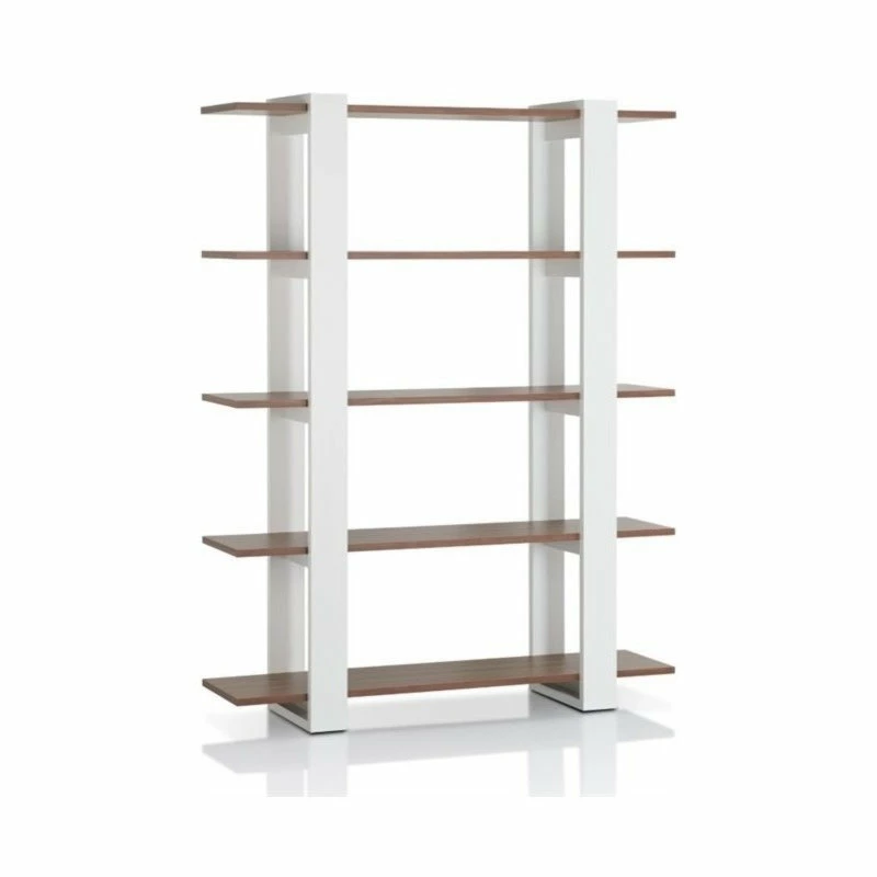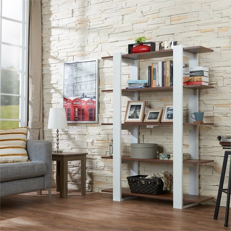 Add flow to your home with the Modern Bess 5-Shelf Bookcase. Five walnut finished shelves are beautifully accented by white interlocking legs that provide stability and a sturdy frame that features wood, MDF and veneer. Open shelves work in your favor, creating an aesthetic that appears clean and crisp. Perfect for housing your collection of books or sprucing up your home with dΓ©cor, the Bess 5-Shelf Modern Bookcase will deliver.