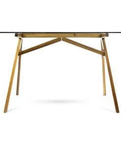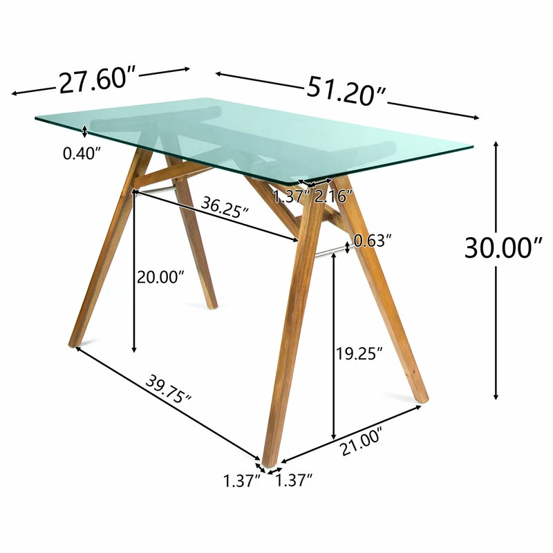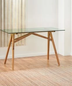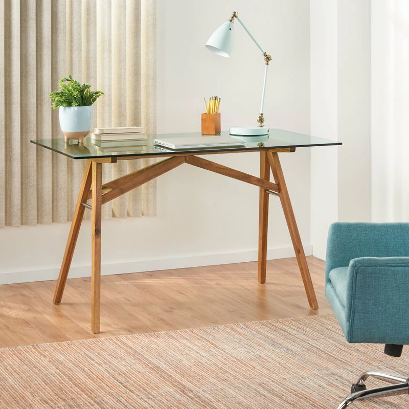 Enhance your work space with a desk that offers your office a sophisticated atmosphere of stunning design. With a tempered glass tabletop and rich acacia wood base, this modern desk will instantly add refinement and class to your work station. This table is finished with gorgeous A-shaped frames that bring both a mid-century modern vibe as well as incredible durability. This bold accent piece will spur your creativity during work and uplift your mind with inspiration for years to come.