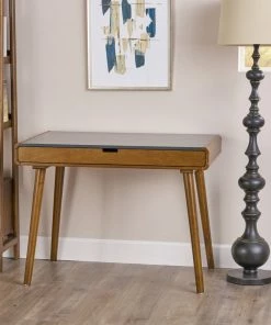 This mid century desk is the perfect addition to any home office or student room. This wooden desk features a large drawer in the center of the desk, ideal for storing anything from writing tools to chargers. Large enough to fit a computer and papers, this desk is sure to be everything you are looking to add to your home office.