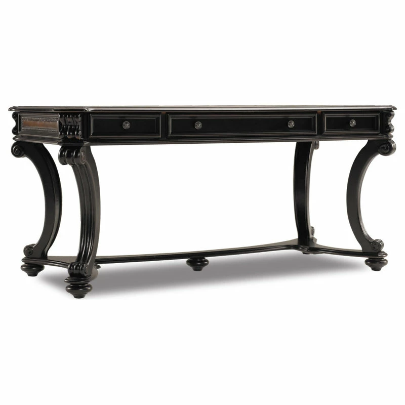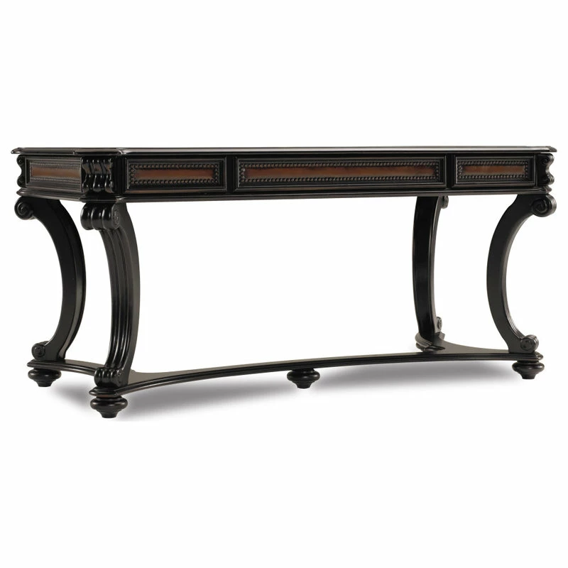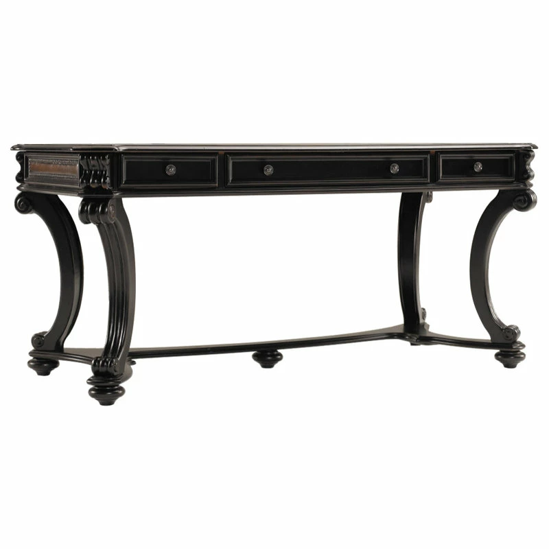 With a hunt country flair and pedigreed design details like curved legs with scroll motifs and carved leather inset panels with nail head trim, the Telluride 66-inch Writing Desk offers a stylish and functional work-from-home solution. Crafted of Cherry Veneers with leather and nail head trim, the black paint finish with reddish brown rub-through presents a rich menswear look. Thereβs a center drawer with drop front for the keyboard, and two utility drawers with removable dividers.