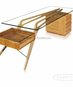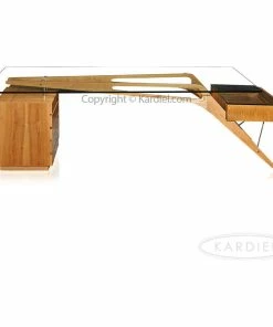 A study of the architectural elements comprising the structure of the Protractor Desk brings full appreciation for the modernist masterpiece. A chair would slide beneath two boomerang Solid wood support beams. At the point where vertical transforms to horizontal, rounded oblong shapes have been cut out of the beams creating a transparent airy illusion. Resting on raised stainless steel support buttons, A 15mm thick tempered glass plate provides an elegant writing surface for Protractor. Stainless steel bolt sleeves float the wooden beams off the surface of the slatted cube of 5 drawers. On the opposite side, total transparency is achieved with an open faced single pull out drawer covered by a 15mm glass panel. Two steel rods extend from the boomerang beams, supporting the outer edge of the transparent drawer. A design marvel exceptionally reproduced and coated with a brilliant lustrous finish.