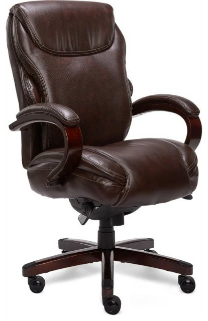 Add a sophisticated flair to any office space with the La-Z-Boy Hyland Executive Office Chair. This brown leather office chair features a flexible AIR lumbar system that pivots to provide back support whenever you shift. Layered memory foam cushions contour to the body for continued comfort. Soft, padded armrests and adjustable height, recline, and tilt functions allow you to find the perfect settings to stay comfortable all day. With high-end finishes like soft bonded leather upholstery and elegant solid wood detailing, this ergonomic office chair offers the ideal blend of style and support for any workspace.