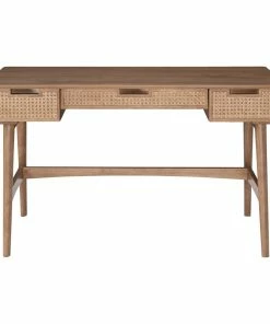 Escape the stuffiness of corporate office decor and bring new life into your home workspace with this mid century inspired rattan desk. The top, side and back panels glow in a natural birch veneer and are complimented by 3 handwoven rattan drawer fronts with cutout handles. The base is made of solid wood and outfitted with glides on its feet to protect hardwood floors. Thereβs no need for productivity and style to be mutually exclusive in your study, bedroom or living room with this timeless piece.