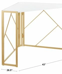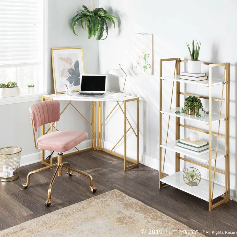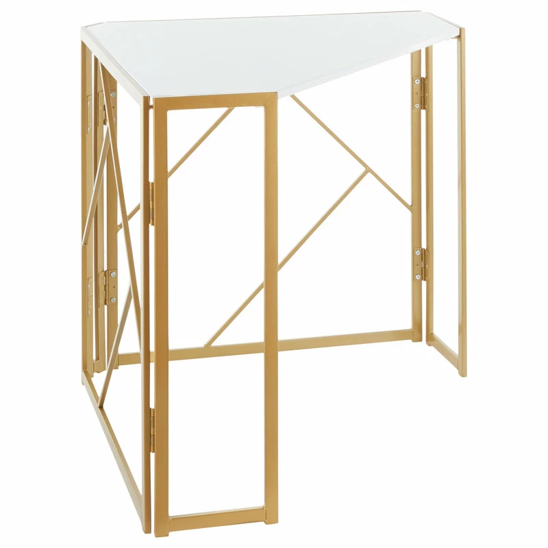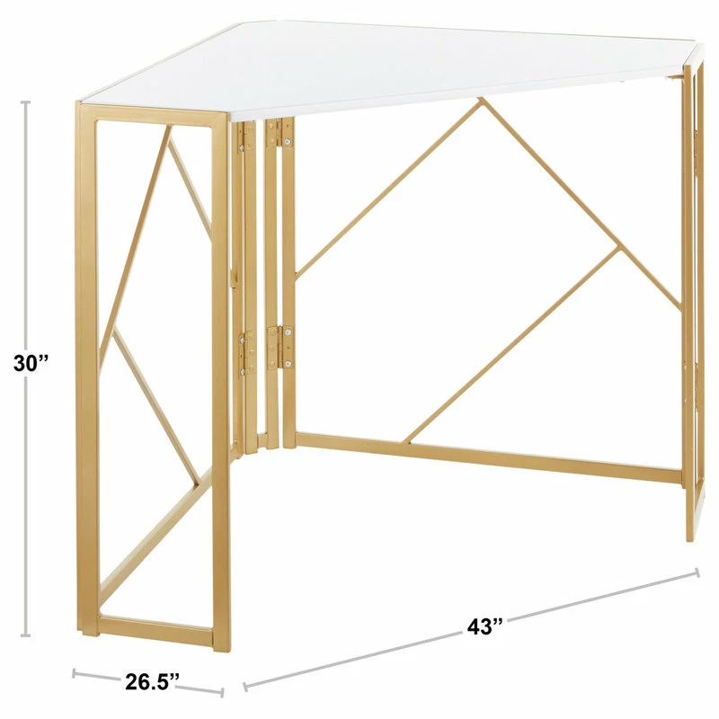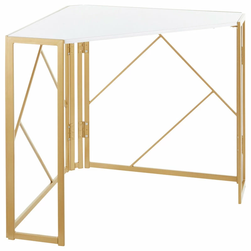 With its pleasant design and modern lines, the Folia Corner Desk by LumiSource is a unique statement in any space. The Folia Corner Desk features a gold metal frame and white wood top, sure to add a touch of glamour to your surroundings. Foldable for easy storage and mobility.