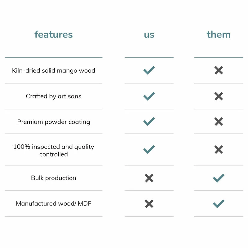 - Made of kiln-dried solid mango wood and powder-coated metal.