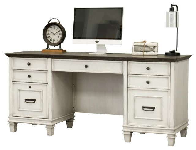Add a sense of rustic and chic design to your home office with the Hartford Double Pedestal Desk. Featuring 2 locking letter file drawers and 4 utility drawers, you can safely store all your important documents and materials. The distressed finish of this desk brings unique character to your workspace.