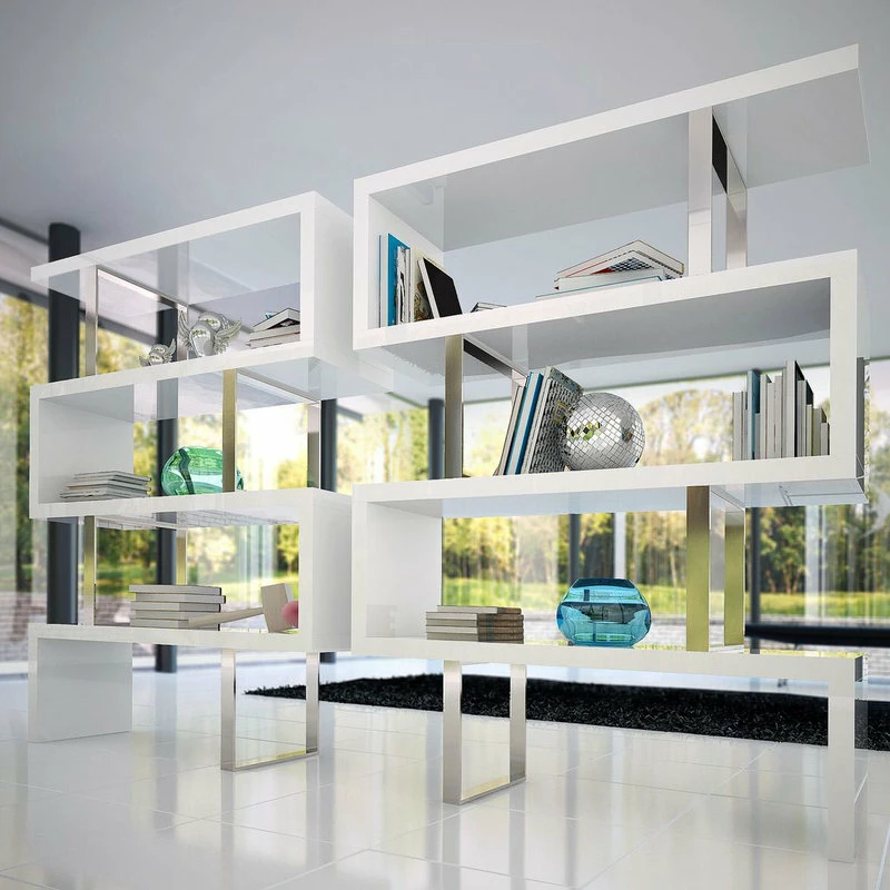 SKU: MD105-LAQ Categories: Bookcases, Shelving Tags: Living room furniture, Standing bookcase, White chrome bookcase, White chrome display shelves, White chrome shelving