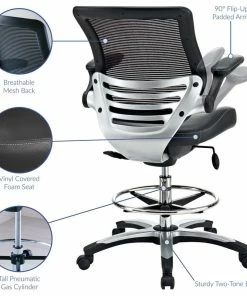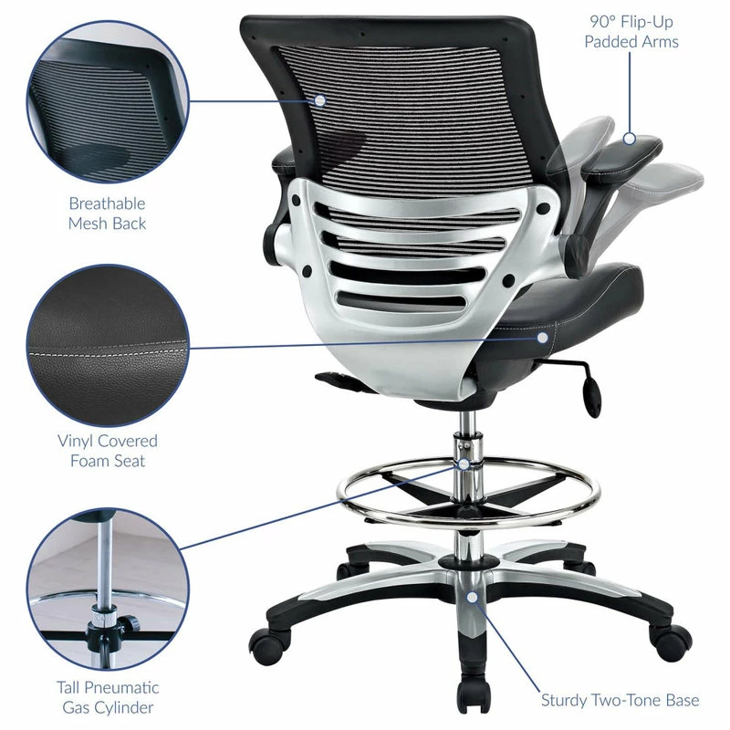 Welcome to a new era in functional comfort. The Edge Drafting Stool implements cutting edge ergonomics to deliver a comprehensive seating experience. Edge features a breathable mesh back for lower back lumbar support, padded waterfall vinyl seat to ease pain and pressure around your thighs, flip-up padded arms, an extra tall gas cylinder with a footring, and it securely locks in place with a user-friendly seat tilt plus tension control knob. Edge is a progressively minded drafting stool perfect for school, work, or home use.