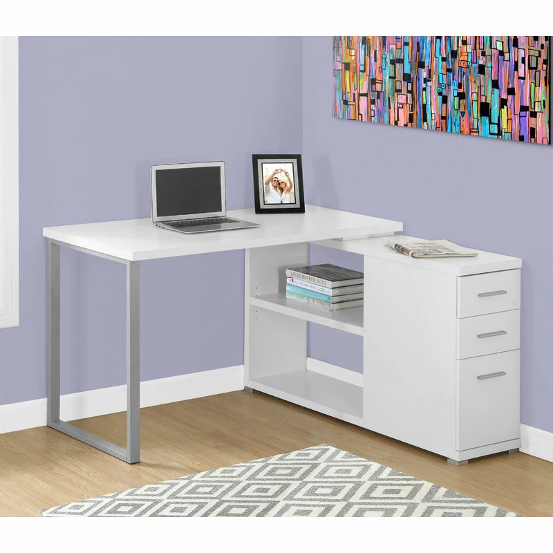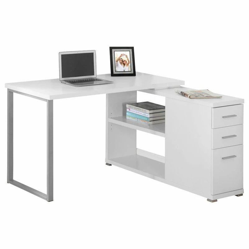 Sleek and contemporary this “L” shaped computer desk will be a stunning focal point in your contemporary home office. With clean lines, thick panel construction and sleek track metal legs, this desk is the perfect combination of function, versatility and design in a modern form. The desktop offers a spacious work surface to meet your working needs without compromising style. The two medium drawers and file drawer accented with silver plastic handles will to help to keep documents and clutter organised without sacrificing storage space. This chic white desk can conveniently be assembled on the left or right side, making this unit uniquely yours to design.