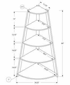 Add the perfect corner piece to your living room, hallway, home office, or den with this cappuccino accent etagere/bookcase complete with four 1″ thick tray style shelves. This contemporary/transitional shelving unit blends well with any decor providing additional display space without sacrificing style. Tipping pervention hardware included.