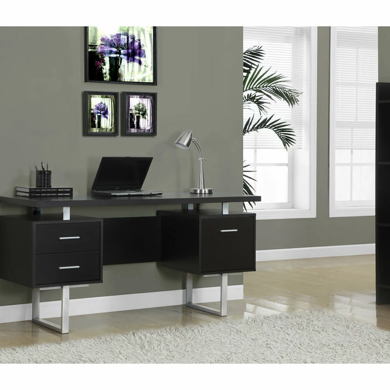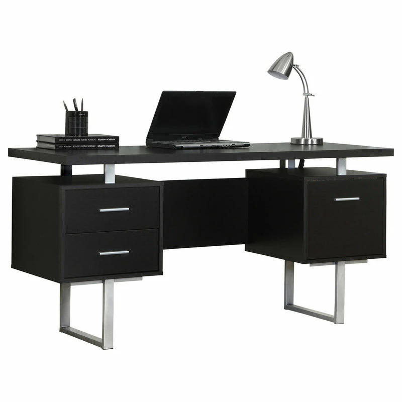 The Silver Contemporary Computer Desk With 3 Drawers combines practicality with unexpected design elements to create a fresh take on this everyday piece. This desk features a floating desktop, sleek metal legs and a cappuccino finish. Two storage drawers and one file drawer help keep you organized. This desk is a fabulous choice for a contemporary office.
