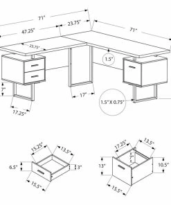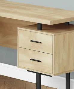 Give your home office a promotion with this extra-large, corner computer desk with 3 storage drawers. The thick-panel, L-shaped floating desktop provides plenty of room for you to spread out everything you need to be productive and allows you to use the tops of the drawer units as extra surfaces. Finished in the same natural wood-look laminate as the desktop, 2 small drawers and 1 large drawer with a bar for hanging files offer space for items you want to keep off the work surface. For flexibility, the drawer units are reversible and can be installed on either side according to your preference. Supporting the desk are metal legs in a black finish with a modern, stylish U shape.