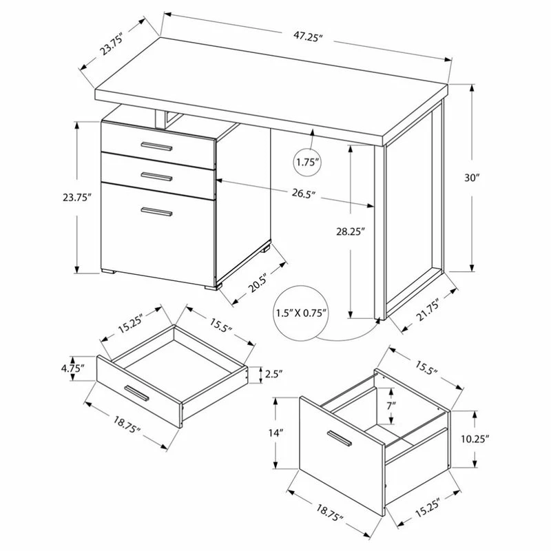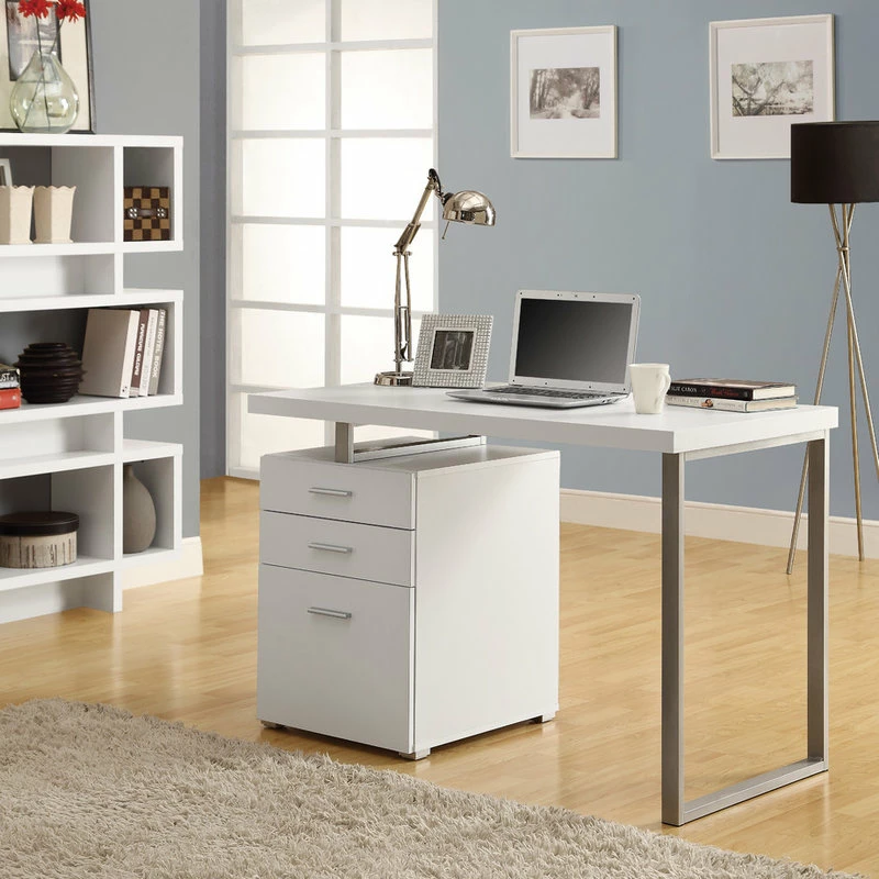 The white Left or Right Facing Computer Desk provides optimal functionality whilst enhancing your office aesthetic with a sleek, modern touch. Featuring a floating scratch-resistant laminate top and sleek track metal legs, this product boasts a storage unit comprising two normal drawers and one file drawer, which can be conveniently assembled on the left or right side. Characterized by clean lines and a streamlined aesthetic, this desk is guaranteed to blend seamlessly with an array of contemporary styes.