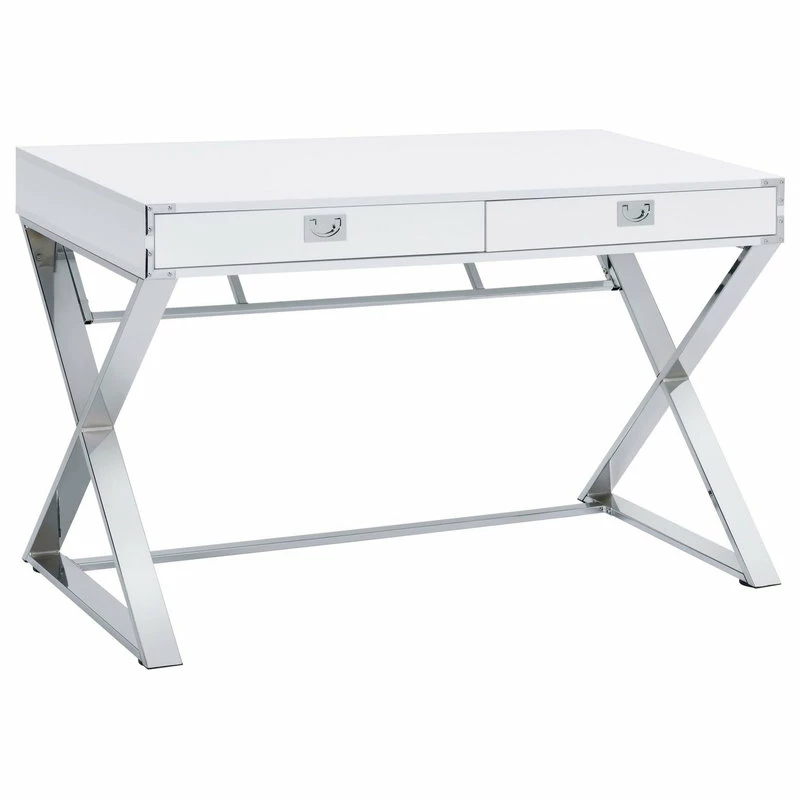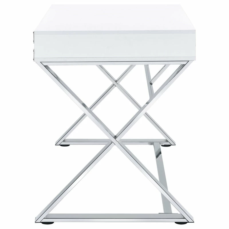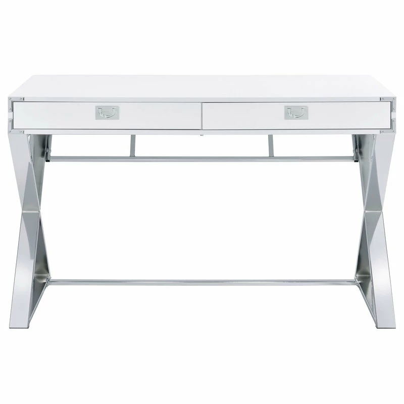 The Picket House Furnishings Estelle Desk in White is sleek and functional, the ideal desk for any home office or entryway. The stylish crisscross silver metal legs provide sturdy support while the glossy finish adds style. With two drawers for holding your desk accessories, this desk is practical yet fashionable. Crafted from a mix of solid and manufactured wood for years of use. Available in two colorways. Add the Estelle Desk to your home for a bold statement.