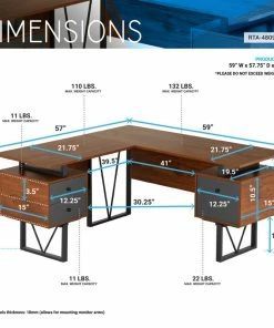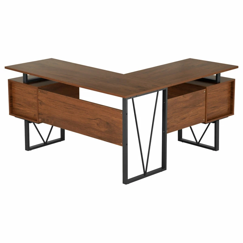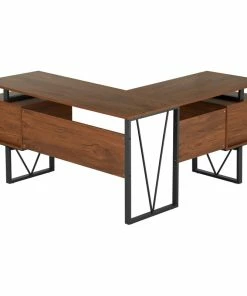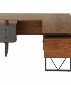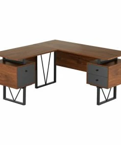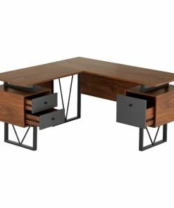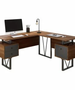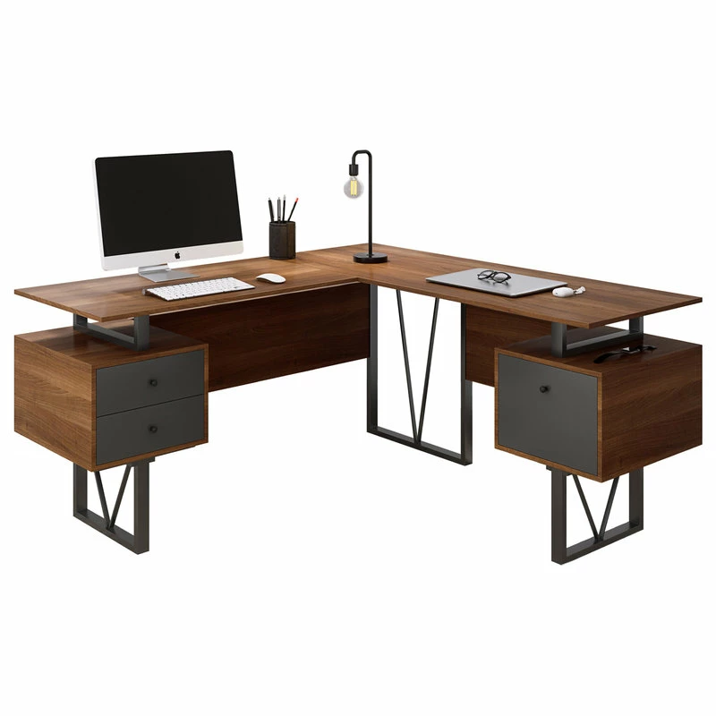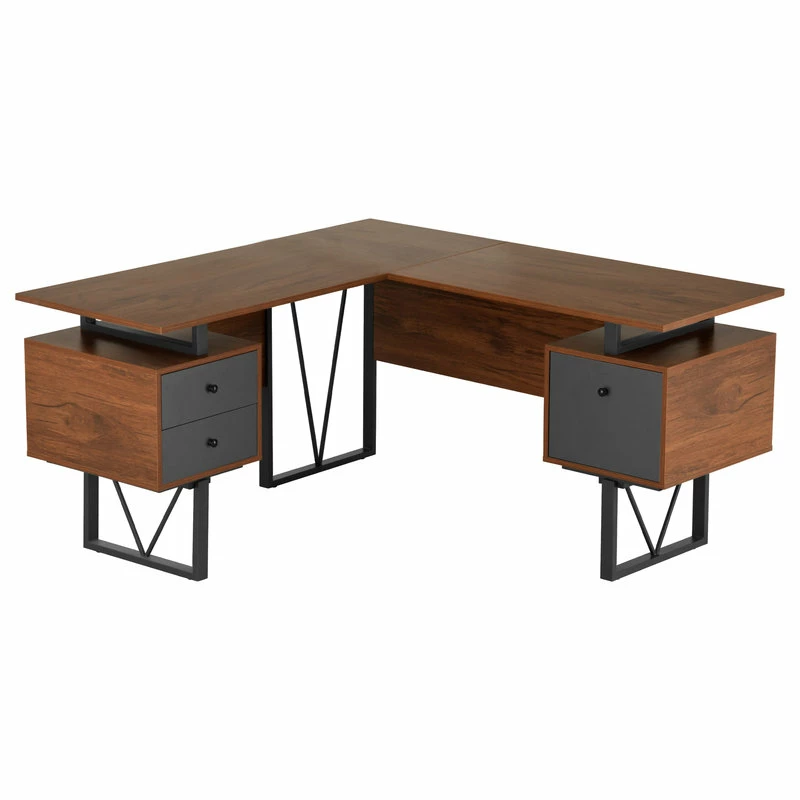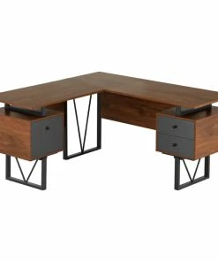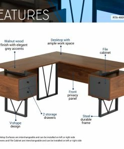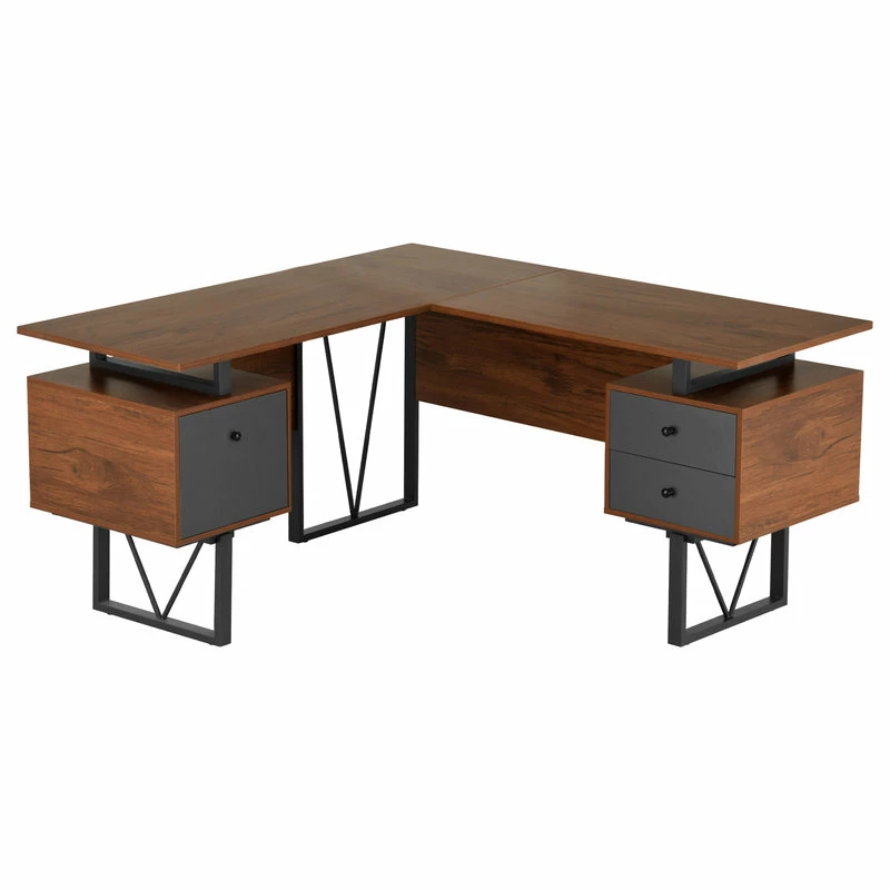 Contemporary design meets industrial style in this curated Techni Mobili Reversible L-shape computer desk. This versatile home office L-shape workstation is crafted with engineered wood with a surface made of PVC laminate. We offer it in a two-tone walnut finish with Gray accents matching to the front Gray panels, adding a classic frame with a V-design to a warm and weathered look. It is equipped with a side file drawer cabinet which provides extra space for keeping legal and letter-sized papers, while on the opposite side two other drawers offer additional storage space. This desk is floating atop on a heavy-duty steel metal frame. This multi-functional desk can be assembled in two ways; desktop panels are interchangeable and can be installed on the left or right side. In the same way, the drawers and the file cabinet are interchangeable and can be installed on either side as per your choice adding the personal touch. It comes with a 5-Yr limited warranty.