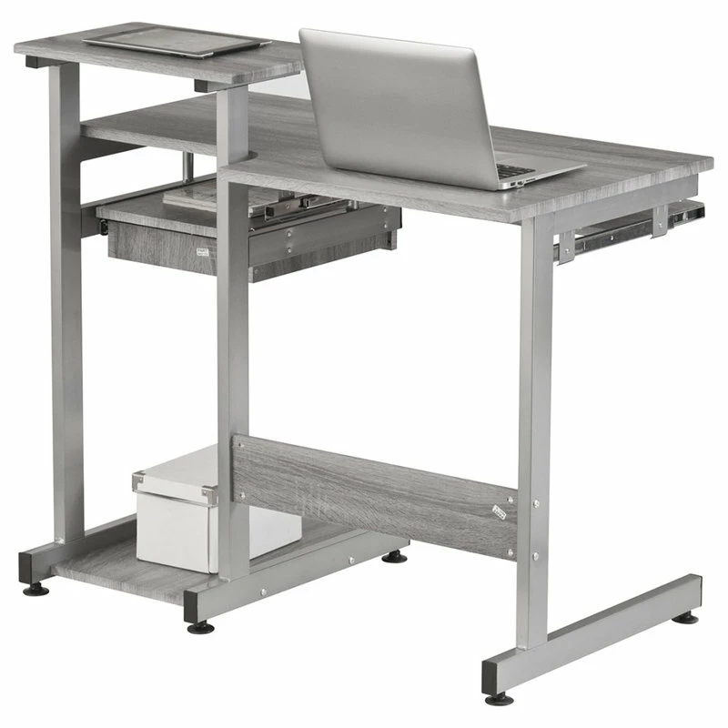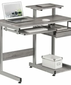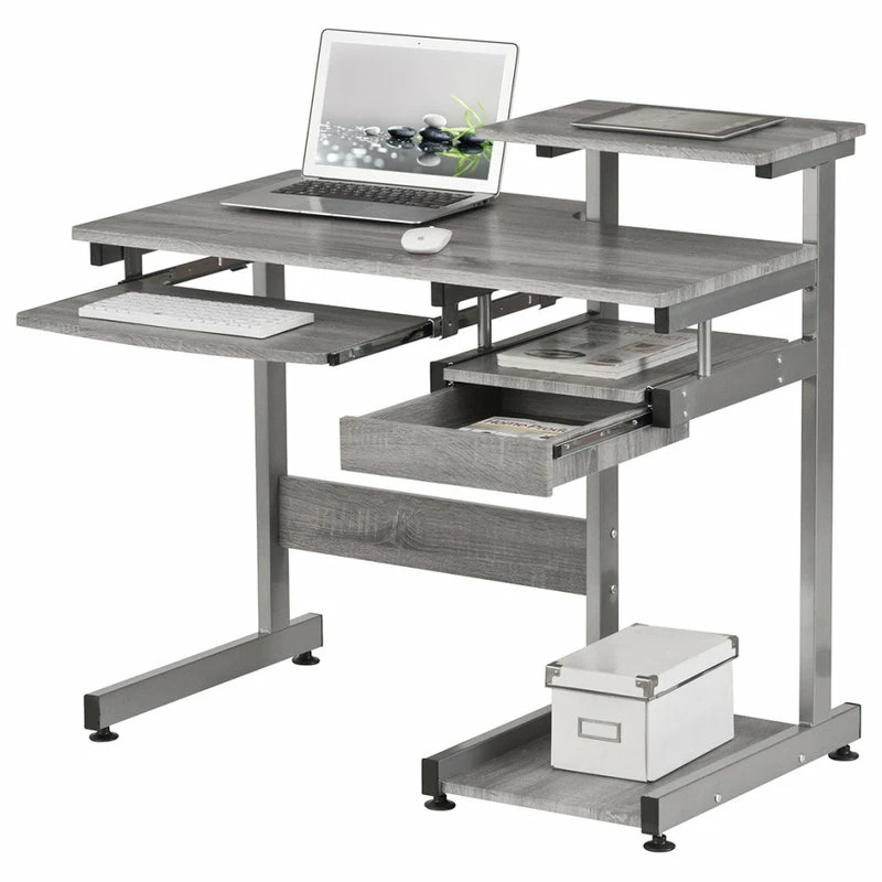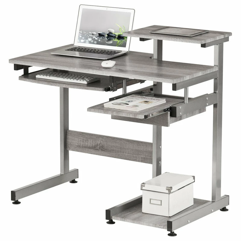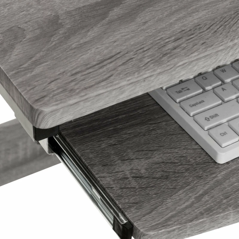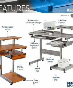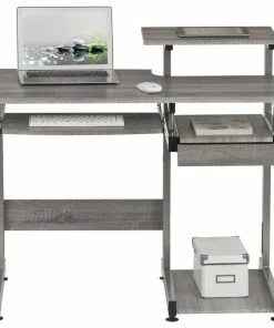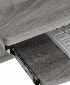 This Techni Mobili Complete Space Saving Computer Workstation lends an air of traditional workmanship to it’s versatile contemporary design. It has a simple yet sturdy design made of heavy-duty engineered wood panels with a moisture resistant PVC laminate veneer and a scratch-resistant powder-coated steel frame. The keyboard shelf , adjacent shelf and utility drawer are all mounted on slide out tracks featuring safety stops and have a 30 lbs. weight capacity. The spacious desktop can hold up to 80 lbs. Color: Gray.