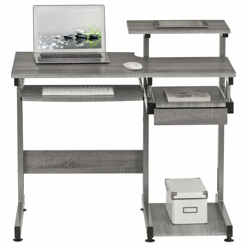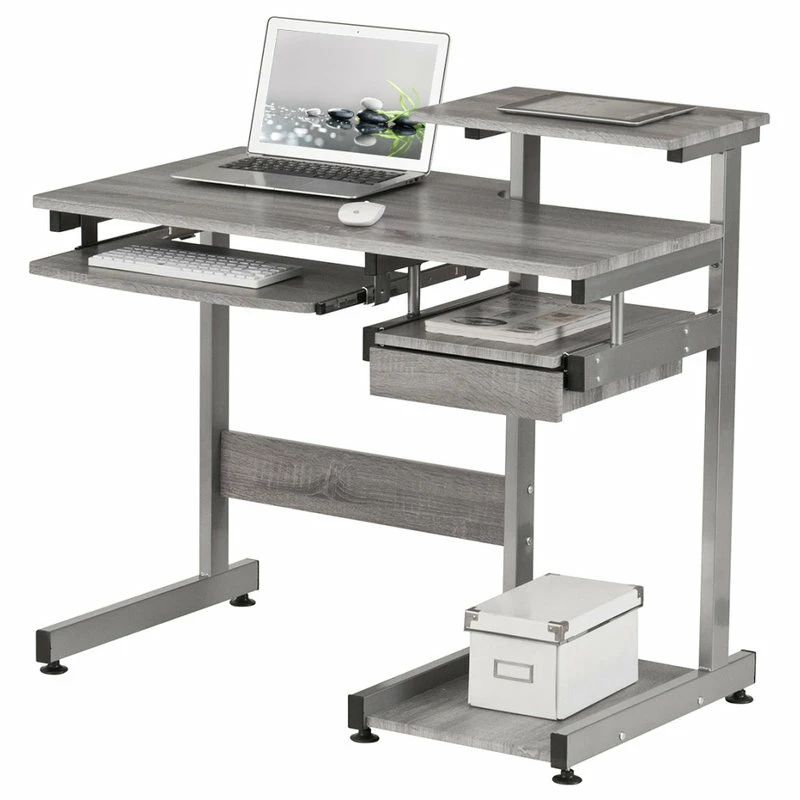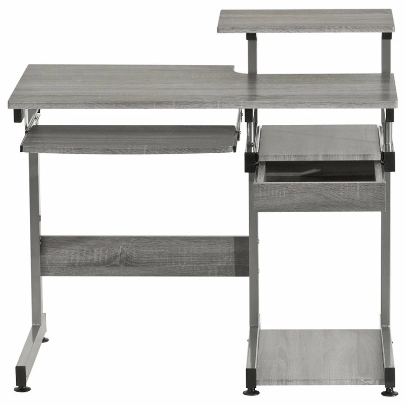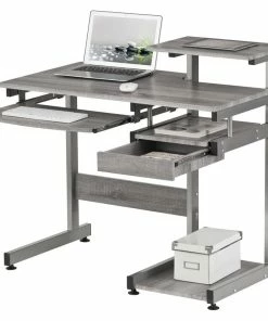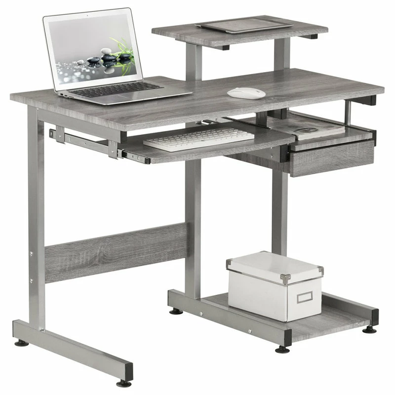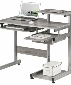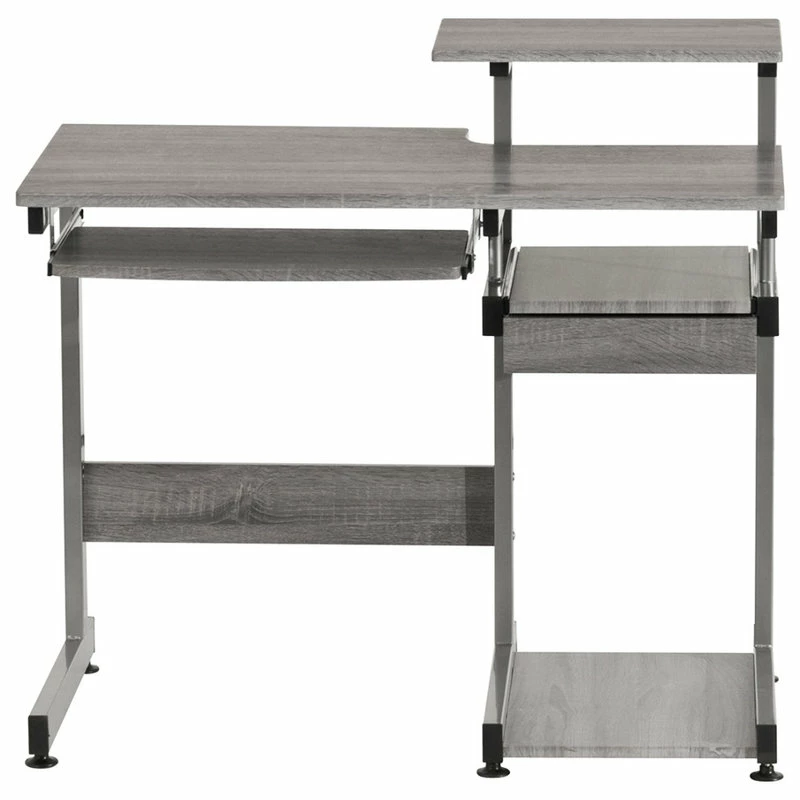 This Techni Mobili Complete Space Saving Computer Workstation lends an air of traditional workmanship to it’s versatile contemporary design. It has a simple yet sturdy design made of heavy-duty engineered wood panels with a moisture resistant PVC laminate veneer and a scratch-resistant powder-coated steel frame. The keyboard shelf , adjacent shelf and utility drawer are all mounted on slide out tracks featuring safety stops and have a 30 lbs. weight capacity. The spacious desktop can hold up to 80 lbs. Color: Gray.