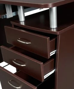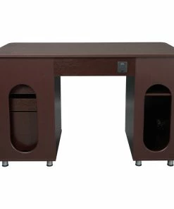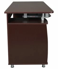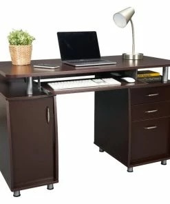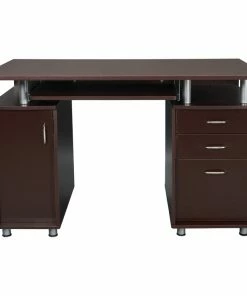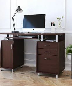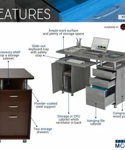 This Techni Mobili Desk is a complete workstation offering an ample work surface and plenty of storage space. It features an accessory shelf atop a storage cabinet, a keyboard panel equipped with a safety stop, 2 drawers and a file cabinet. The CPU/Storage cabinet not only has a removable shelf that can be pleased up, down or completely removed but also has a large back opening for cables. The desktop has an 80lbs weight capacity, while the shelves can each hold up to 30lbs, and the drawers each have a 22lbs weight capacity. This elegant desk is made of heavy-duty MDF panels with a moisture resistant PVC laminate veneer atop scratch-resistant powder-coated steel supports. Color: Chocolate.