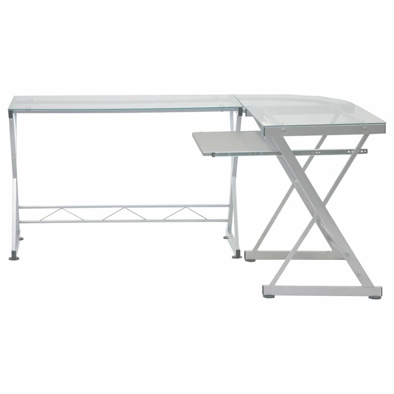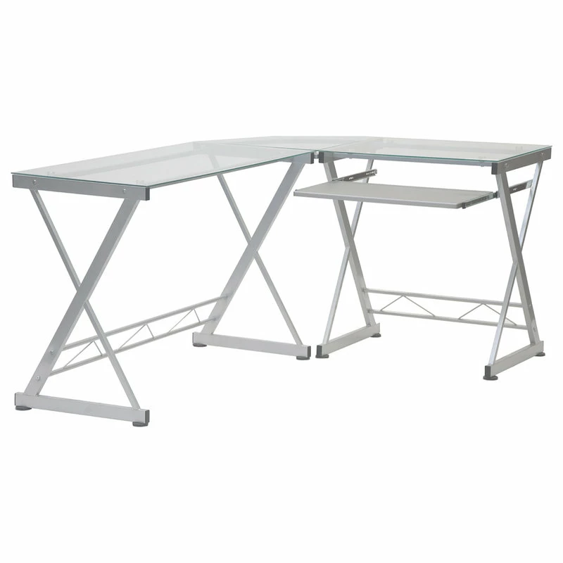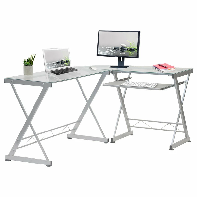 This Techni Mobili L-shaped Glass Computer Desk embodies the essence of modern design with a minimalist yet functional design that can be configured to your preference, with the long and short sides being interchangeable. It is made with a heavy-duty 6 mm tempered safety glass desktop, scratch-resistant powder-coated steel frame, and a heavy-duty engineered wood panel with a moisture resistant PVC laminate veneer for the slide-out keyboard shelf equipped with a safety stop. The square glass desktop panels can each hold up to 66 lbs, the corner glass desktop panel have a 44 lb weight capacity, and the keyboard shelf can hold up to 22 lbs. COLOR: Clear glass.