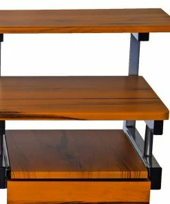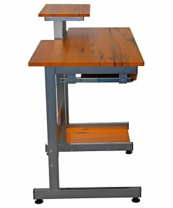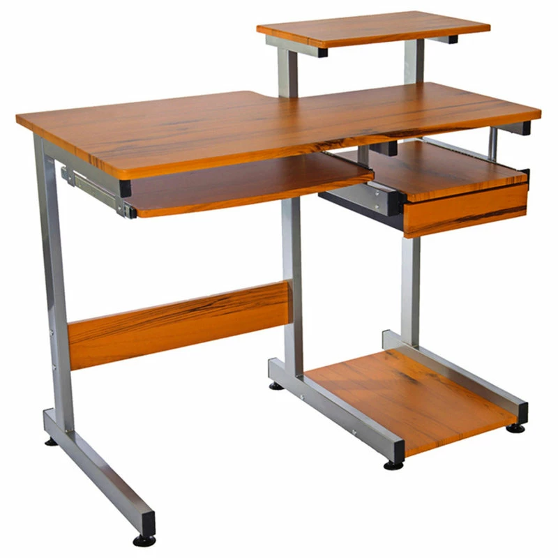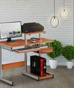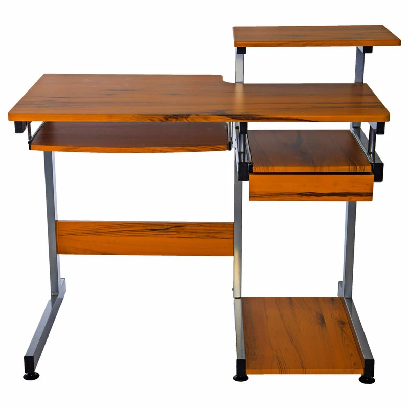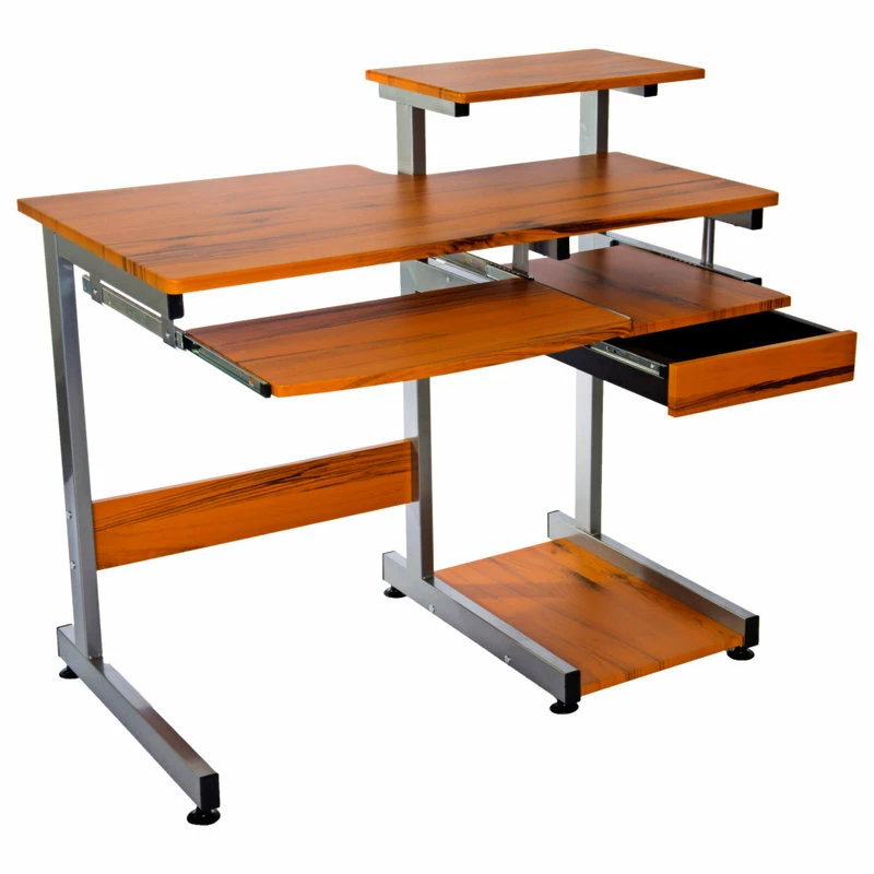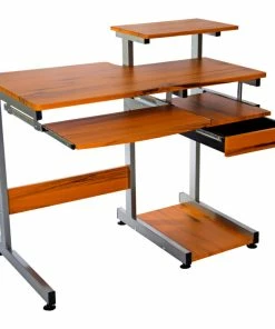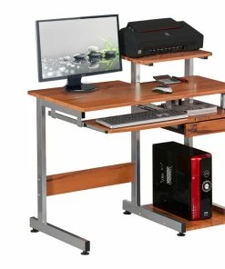This Techni Mobili Multifunction Computer Desk saves space with its compact footprint. It has a simple yet sturdy design made of heavy-duty engineered wood panels with a moisture resistant PVC laminate veneer and a scratch-resistant powder-coated steel frame. A 10-slot media holder is mounted between the desktop and accessory shelf. The keyboard shelf and adjacent shelf and utility drawer are all mounted on slide out tracks featuring safety stops. The slide-out keyboard shelf, bottom CPU storage shelf, utility drawer, and two accessory shelves each have a 30 lb weight capacity, while the spacious desktop can hold up to 80 lbs. COLOR: Wood Grain.