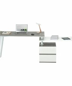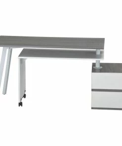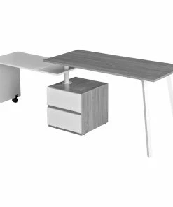This Modern Techni Mobili Rotating Workstation offers just the right amount of desktop space needed for every task. Its unique design of rolling caster-equipped side table, pivots around a two-drawer cabinet. Customize the table to an L-Shape for corner areas, extend it for a more wider surface or close it for tighter spots. This space-saving nested desk is made of MDF panels with a moisture-resistant PVC laminate surface, supported by sturdy legs of powder-coated steel. Color: Gray