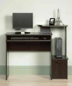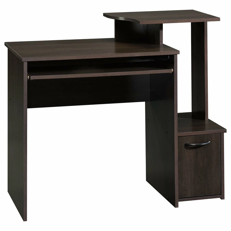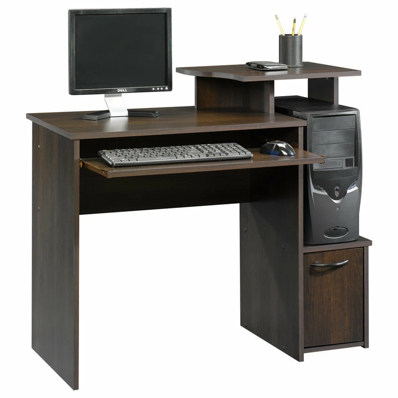 Just purchased a new desktop or laptop computer? Give it a new home with this computer desk from the Beginningsยฎ collection. An elevated monitor/printer shelf allows you to keep your office ergonomics in check and have your printed papers close by. This home office desk features a slide-out keyboard/mouse shelf to keep the top surface space clear for your notepad. With you in mind, a dedicated space for a vertical CPU tower keeps your small home office desk tidy and organized. Additional storage can be found behind the lower door, perfect for storing books, folders, and other essential office supplies. Finished in Cinnamon Cherry, this stylish desk will get you organized and help you get the job done. We hope you like what you see. Sauder designers travel the world and bring back the best and latest in style, finish, and color trends. This inspiring world travel is evident in the cutting edge and innovative furniture solutions we offer to you!
