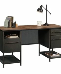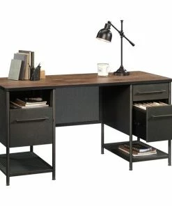 Create the wow factor in your home office or workspace with this industrial-inspired executive desk from the Boulevard Cafe collection. Its spacious tabletop provides yours with room for your laptop, folders, stationery, and all other office essentials – that includes your coffee mug. It features three drawers with full extension slides that open and close on smooth metal runners. Meet all your filing needs with the two lower drawers that accommodate letter-size hanging files. For additional storage, it also includes a cubbyhole along with two lower open shelves for easy access storage of books and papers. It is constructed from a durable, powder-coated metal frame and is accented with perforated metal panels to add an extra splash of unique style to this already beautiful office desk. Finished on all sides in black with a vintage oak accent, this visually stunning desk gives your office an exclusive look and will have you feeling like a top executive.