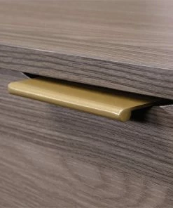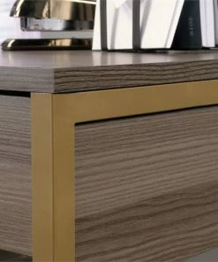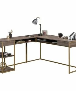 Your home office is allowed to be stylish too. Dress up your office space when you add the sophisticated style and modern design of this L-shaped desk from International Lux collection. Its spacious top surface provides you with all the room you need for your must-have desk essentials like your laptop, stacks of notepads, your array of pens and of course your coffee mug too. It features two storage drawers that open and close on smooth metal runners for easy access storage of miscellaneous items likes loose papers and folders. It also features open shelving with a fixed shelf and cubbyhole storage options for all your other office necessities. The desktop features grommet holes so you can keep your cords organized and out of the way. Its finished on all sides for versatile placement throughout your home. Finished in diamond ash and detailed with a gold, powder coated metal frame, this handsome desk is just what your office needs.