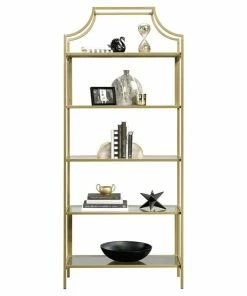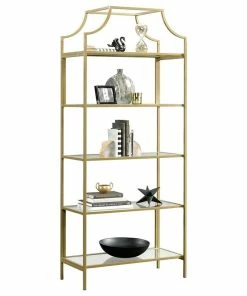 Give your space a sophisticated update with this bookcase from the International Lux collection. Storage that makes a statement. Create a one-of-a-kind look in your home when you add the sophisticated style and modern design of this bookcase. It features open shelving with safety-tempered glass so you can store and display books, plants, dΓ©cor and more. These spacious shelves provide you with the perfect amount of space to display all your favorite dΓ©cor items like a vase of flowers, your array of knick-knacks, framed photos and any other of your life’s most prized possessions. Its rounded edges and curved indent design give it a stunningly unique appearance that is sure to grab the attention of your friends and family. Constructed from metal and finished in Satin Gold color, this elegant bookcase will have any room in your home feeling luxurious and chic. Constructed with a sturdy metal frame and finished on all sides in satin gold, this stunning bookcase is everything your home needs and more.