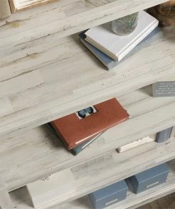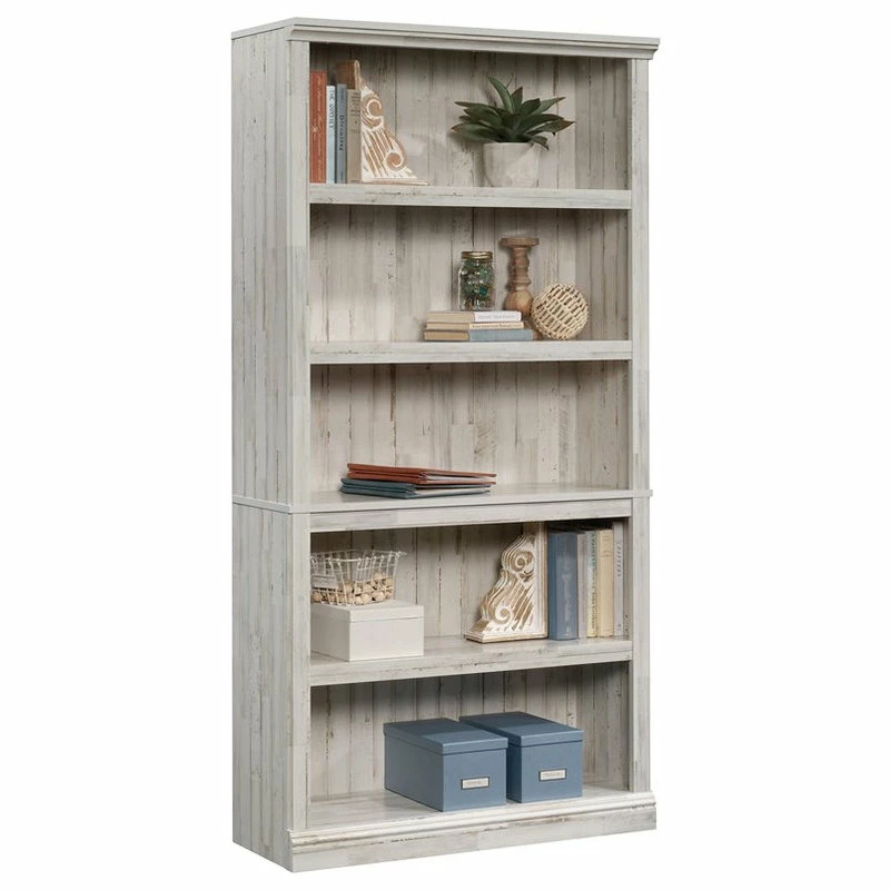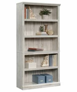 Store it or display it. Create a designated space in your home for all your things without having to sacrifice on the style that you love with this 5-shelf bookcase from the Sauder Select collection. This living room bookcase features five large shelves that provides you with an endless amount of space to store a variety of items like your collection of gardening magazines, your favorite novel, work supplies and organizing bins. These spacious shelves also make a great place to display decorative items like knick-knacks, framed photos of your family, and all your awards. This tall bookcase includes three adjustable shelves that can move to different heights to create flexible storage for items of all shapes and sizes. It has a place for all your things. Its attractive good looks and versatile design make this storage bookcase the perfect fit for any room in your home. Finished in White Plankยฎ, this 5-shelf book is the answer for an organized home or office.