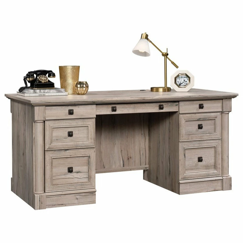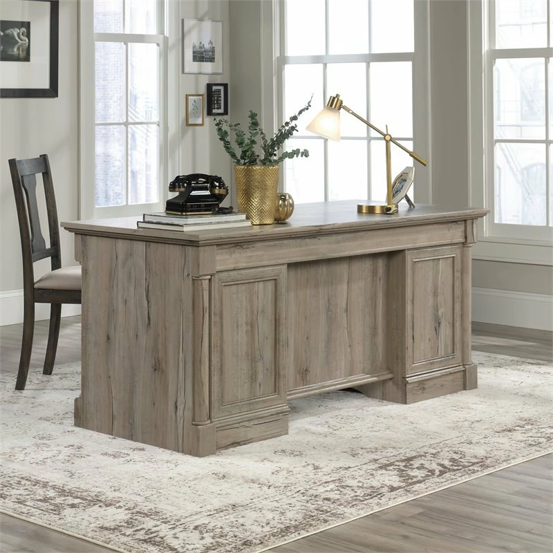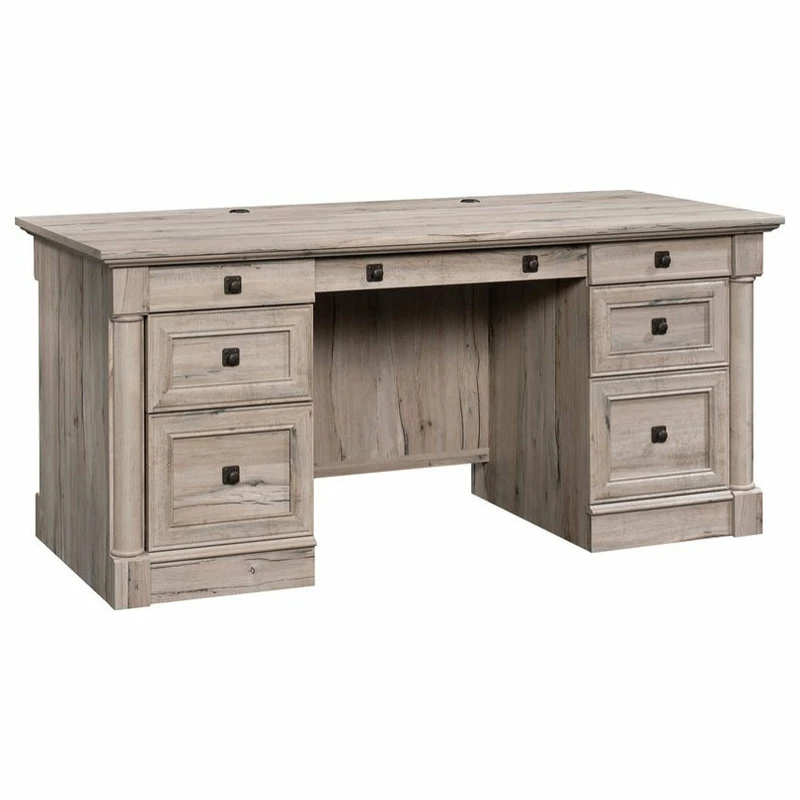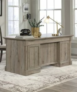 Itβs time for your inner boss to shine! Create a one-of-a-kind work environment with the beautiful style and design of this executive desk from the Palladia collection. This home office desk offers a spacious top surface that provides you with the room you need for all your desk essentials like your laptop, stacks of notepads, and your hot cup of coffee. It also has space for items like an accent lamp and picture frames. This computer desk features a large drawer/shelf that features a flip-down panel for your keyboard, mouse, or laptop. This office executive desk also features two pencil drawers and two storage drawers that open and close on smooth metal runners for convenient use. The lower drawer with full extension slides accommodates letter, legal, or European size hanging files to help keep you organized. Keep cords and wires organized. This executive desk includes two desk top grommets and numerous pass-throughs. Finished in Split Oak and detailed with attractive hardware, this computer desk with storage will have you feeling motivated and ready to work!