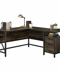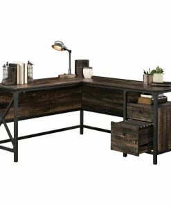Your office deserves to be stylish too! Update the look of your home office or workspace with the industrial-inspired style and design of this L-shaped desk from the Steel River collection. This office desk offers a spacious work surface that provides room for all your office must-haves like your laptop, stacks of notepads, writing utensils and your hot cup of coffee. It even has space for home dΓ©cor items like an accent lamp and decorative plants. This industrial desk features a small storage drawer that opens and closes on smooth metal runners. It also features a lower drawer with full extension slides that can hold letter-size hanging files so you can keep important papers organized. Its cord management system includes two desktop grommets to keep your cords neat and out of the way. This industrial office desk features a textured, powder coated metal frame and corners accents. Itβs finished on all sides so itβll look great from any angle. Finished in carbon oak, this stunning L-shaped desk is just what your home office needs.