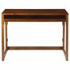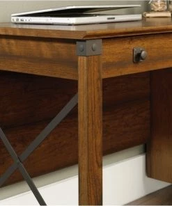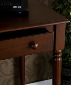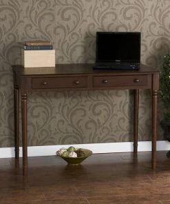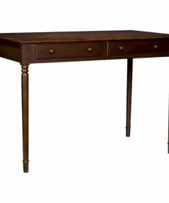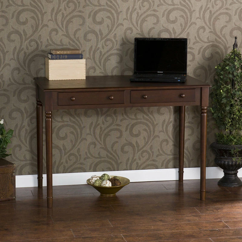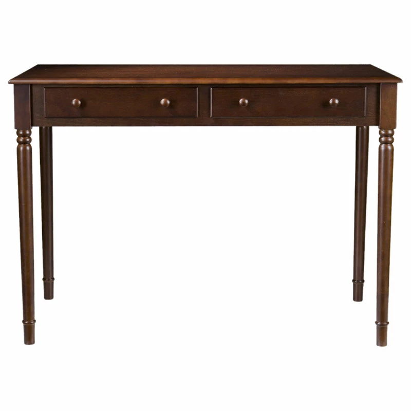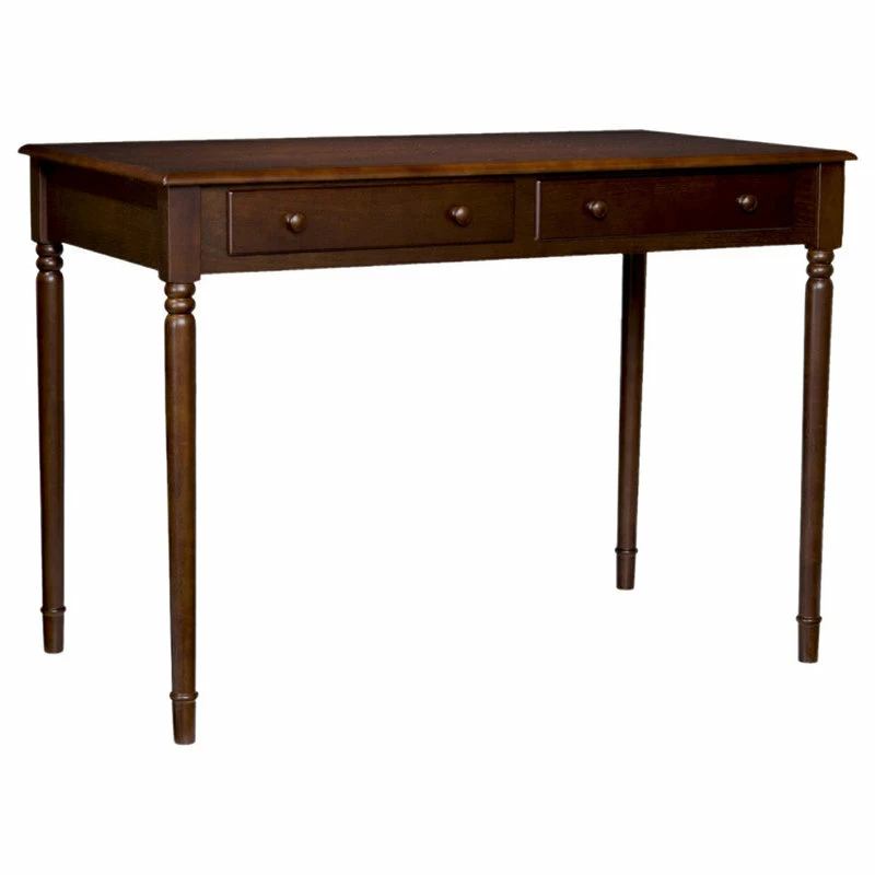 Designed with farmhouse appeal, this writing desk is sure to create a wonderful accent among your decor. Two deep drawers are accessible from the front of the desk with color matched knobs. Combining a wood grained espresso finish with traditional, carved spindle leg details creates a blend of simple style and country elegance. Finished on all four sides, so it looks great center stage. Add this beautiful writing desk to your home for convenience and class.