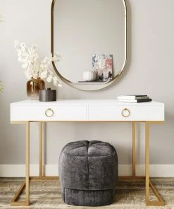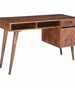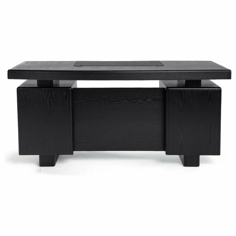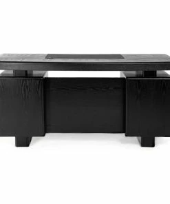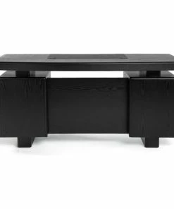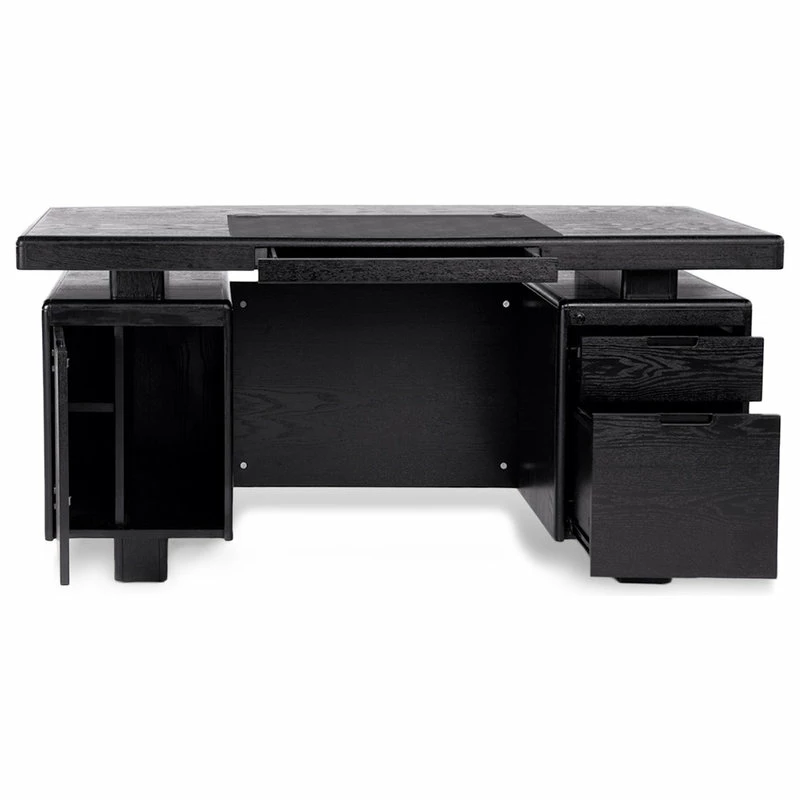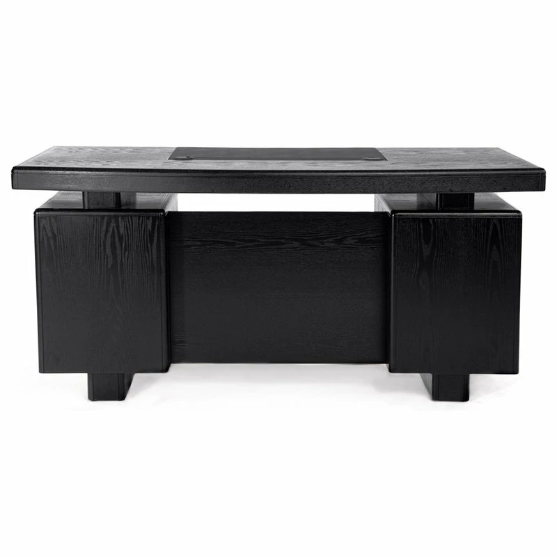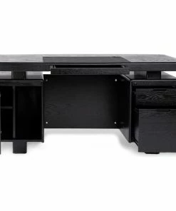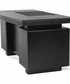 The Monroe desk boasts an array of storage space making it a compact yet functional dream desk. It is crafted from a rich black stained American oak wood veneer with an open grain finish. Features include two locking drawers, one of which accommodates letter and legal filing. There is also a large pencil drawer, faux leather desktop writing pad, wire management portholes, and a hidden CPU tower storage compartment. With all of its’ functional and aesthetic qualities, the Monroe desk is a perfect statement piece for a sleek, modern working environment.
